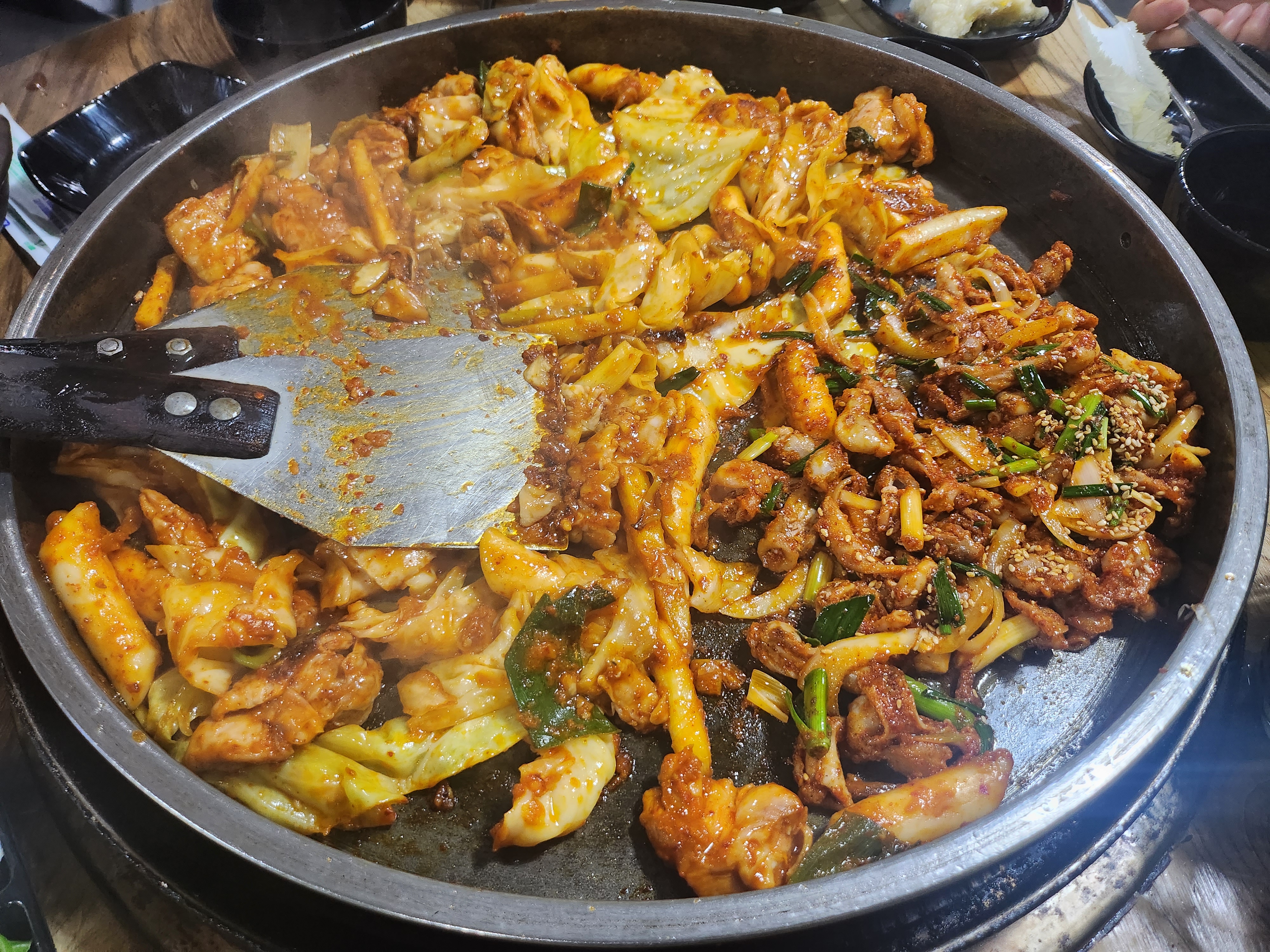 먹고 있을 때 방문하신 손님들은 자리가 없어 그냥 가신분들이 몇 팀 계셨고 나올 때쯤 들어오는 손님들이 있었는데 재료소진으로 못 받으시는 거 같았습니다. 저희는 3명이 함께 방문해서 푸짐하고 맛있는 양념의 닭갈비와 쫄깃한 내장볶음을 너무 잘 먹고 나왔습니다.