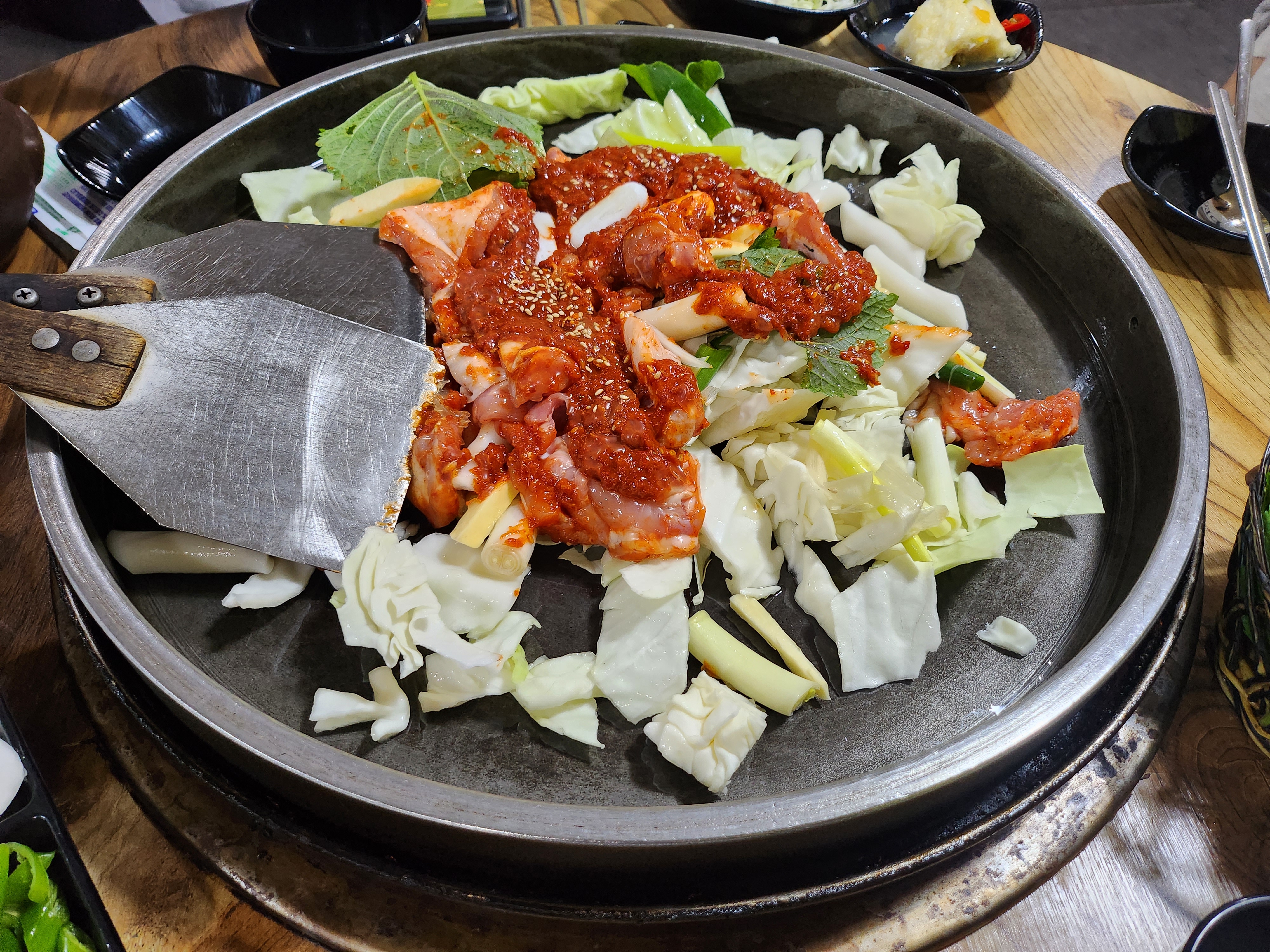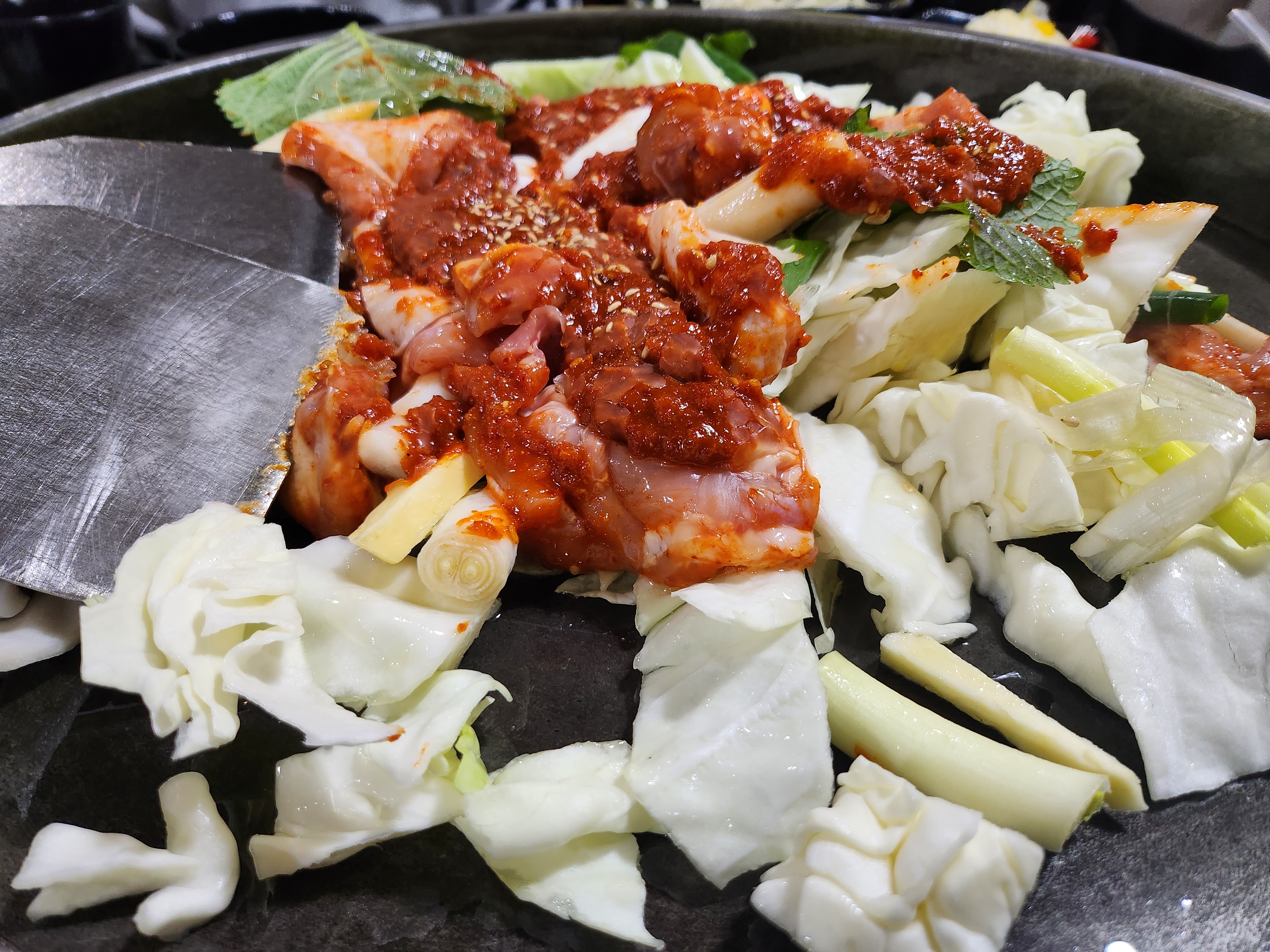 양배추와 닭갈비를 같이 싸서 한입 먹습니다. 맛있는 닭갈비 맛인데 자극적인 맛보다는 담백한 맛에 좀 더 치우친 거 같습니다.