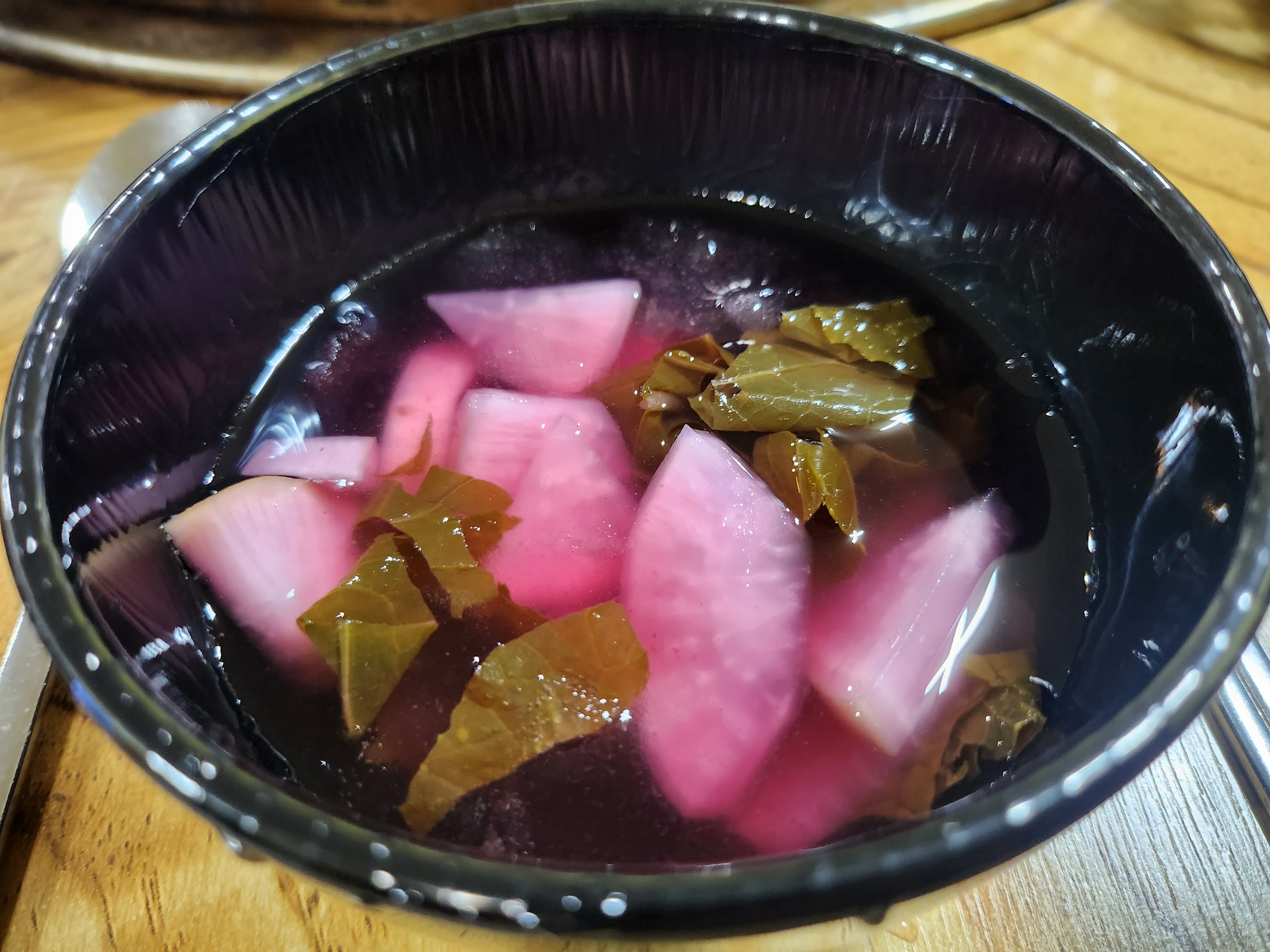 보랏빛이 도는 동치미인데 비트를 넣어 그런 거 같습니다. 동치미 맛은 너무 시원하고 개운했습니다.