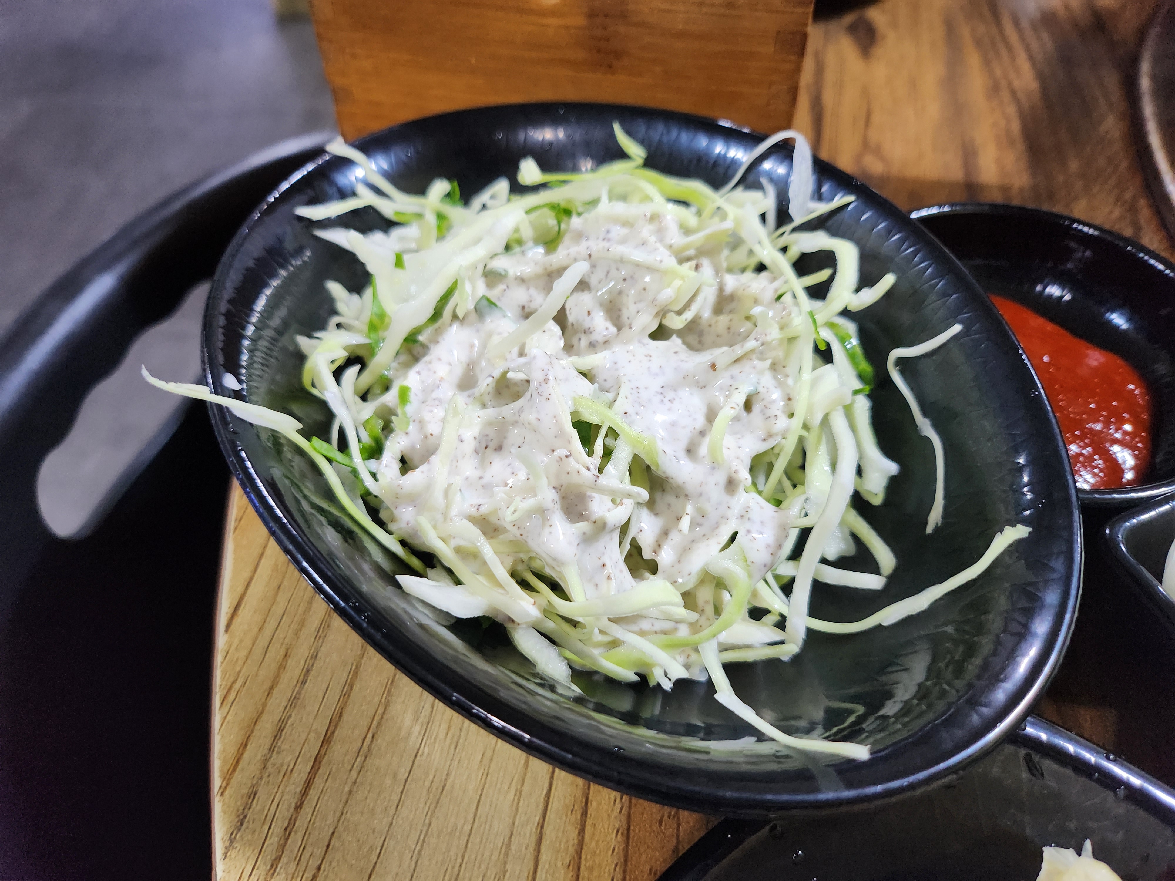 양배추 샐러드에 참깨소스를 뿌려주시는데 기성품맛입니다.