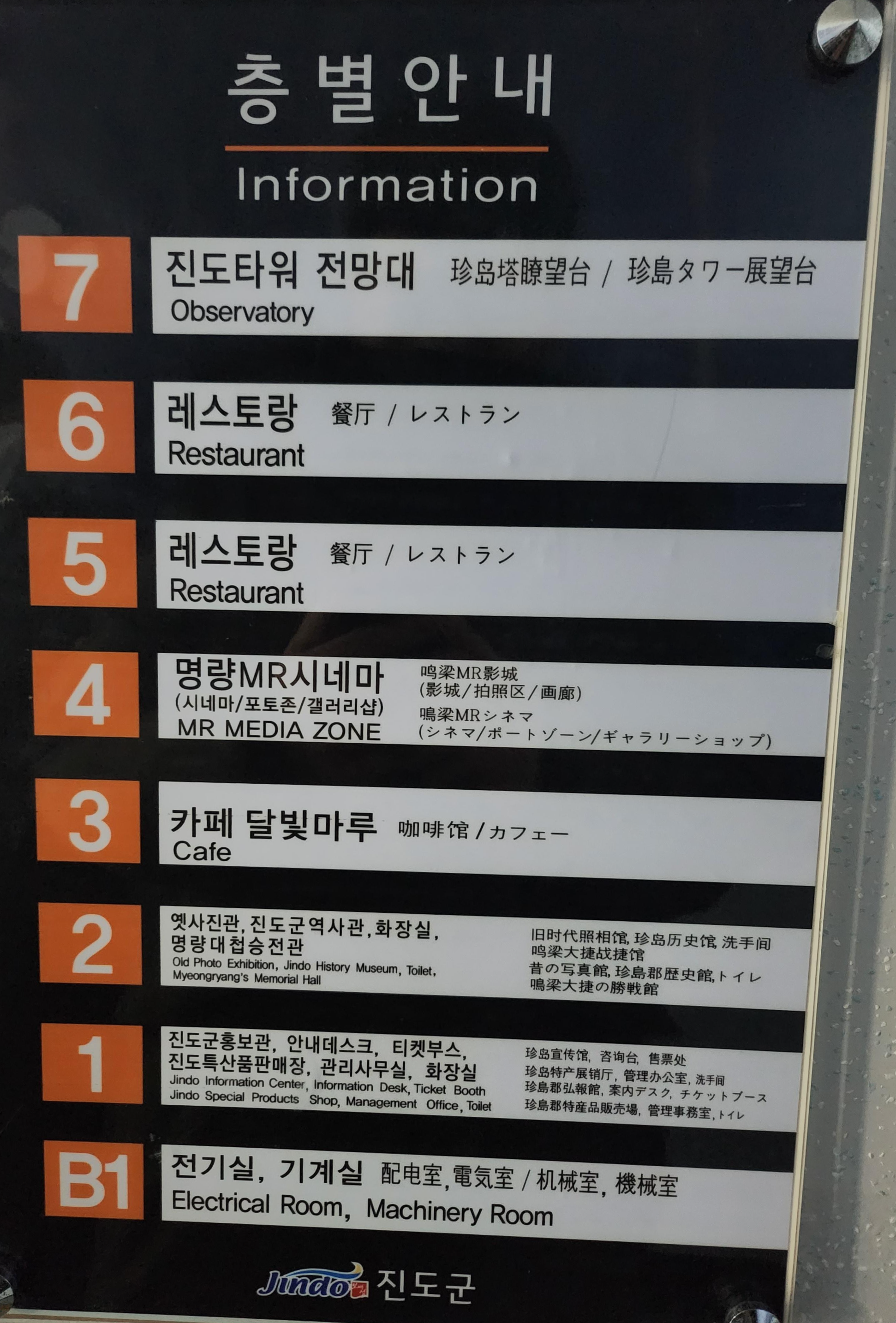 엘리베이터 문 옆에 층별 안내가 붙어 있습니다. 1층 홍보관, 티켓부스 등이 있고 2층은 진도역사관 등이 위치해 있습니다.
