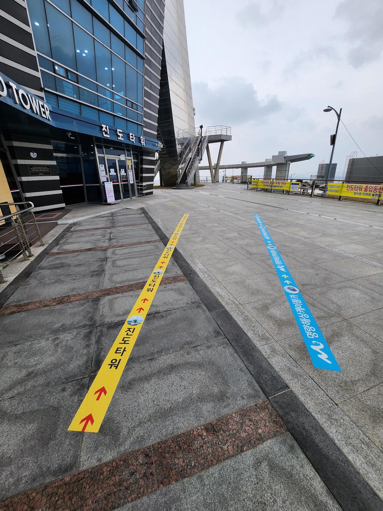 계단들을 올라오면 진도타워로 가는 길과 명량해상케이블카 타는 길을 화살표로 표시하고 있습니다.