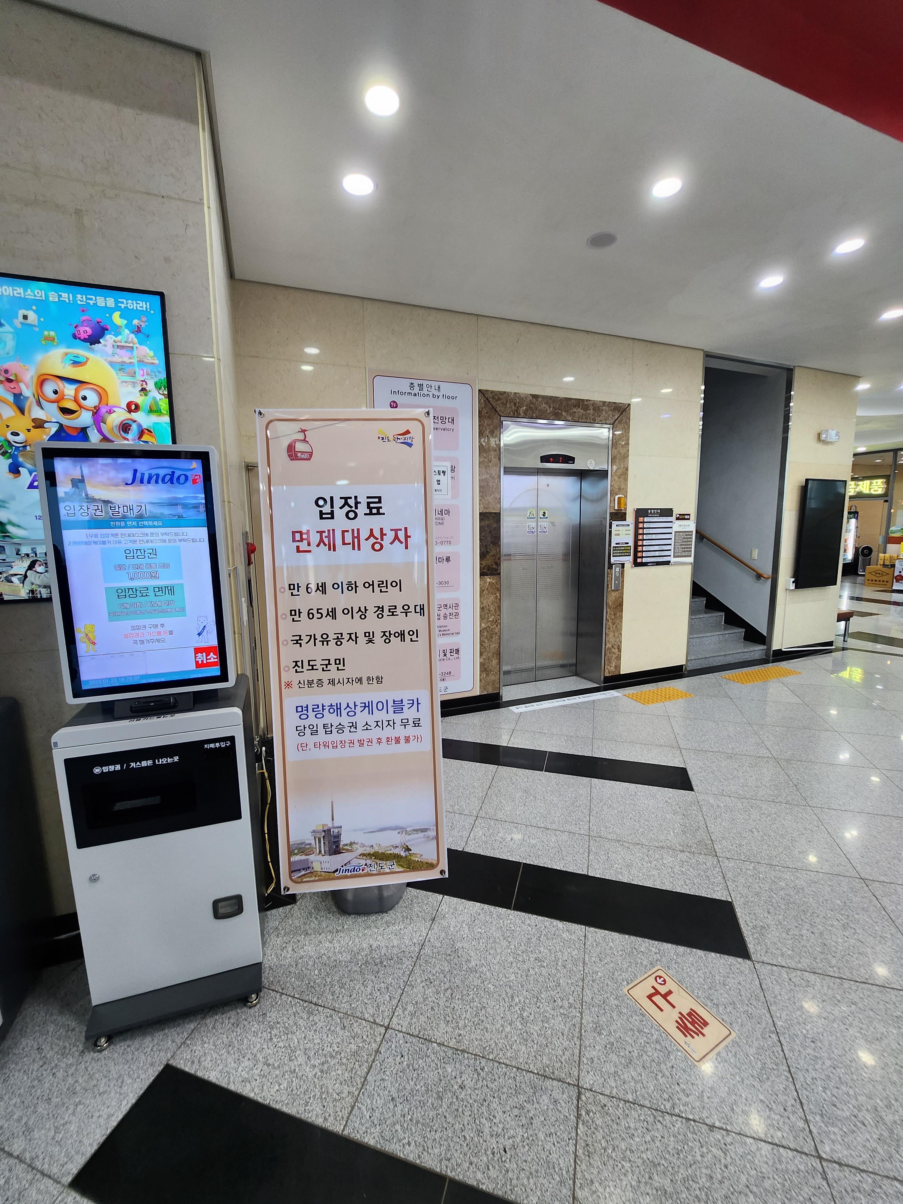 엘리베이터 문 옆에 층별 안내가 붙어 있습니다. 1층 홍보관, 티켓부스 등이 있고 2층은 진도역사관 등이 위치해 있습니다.