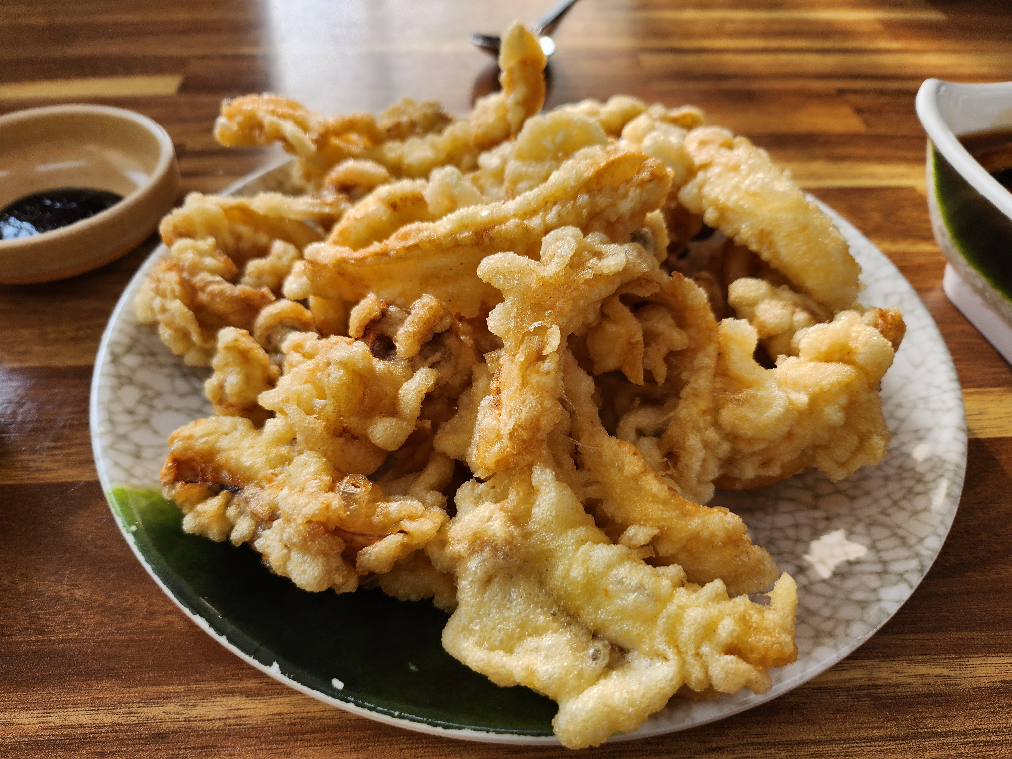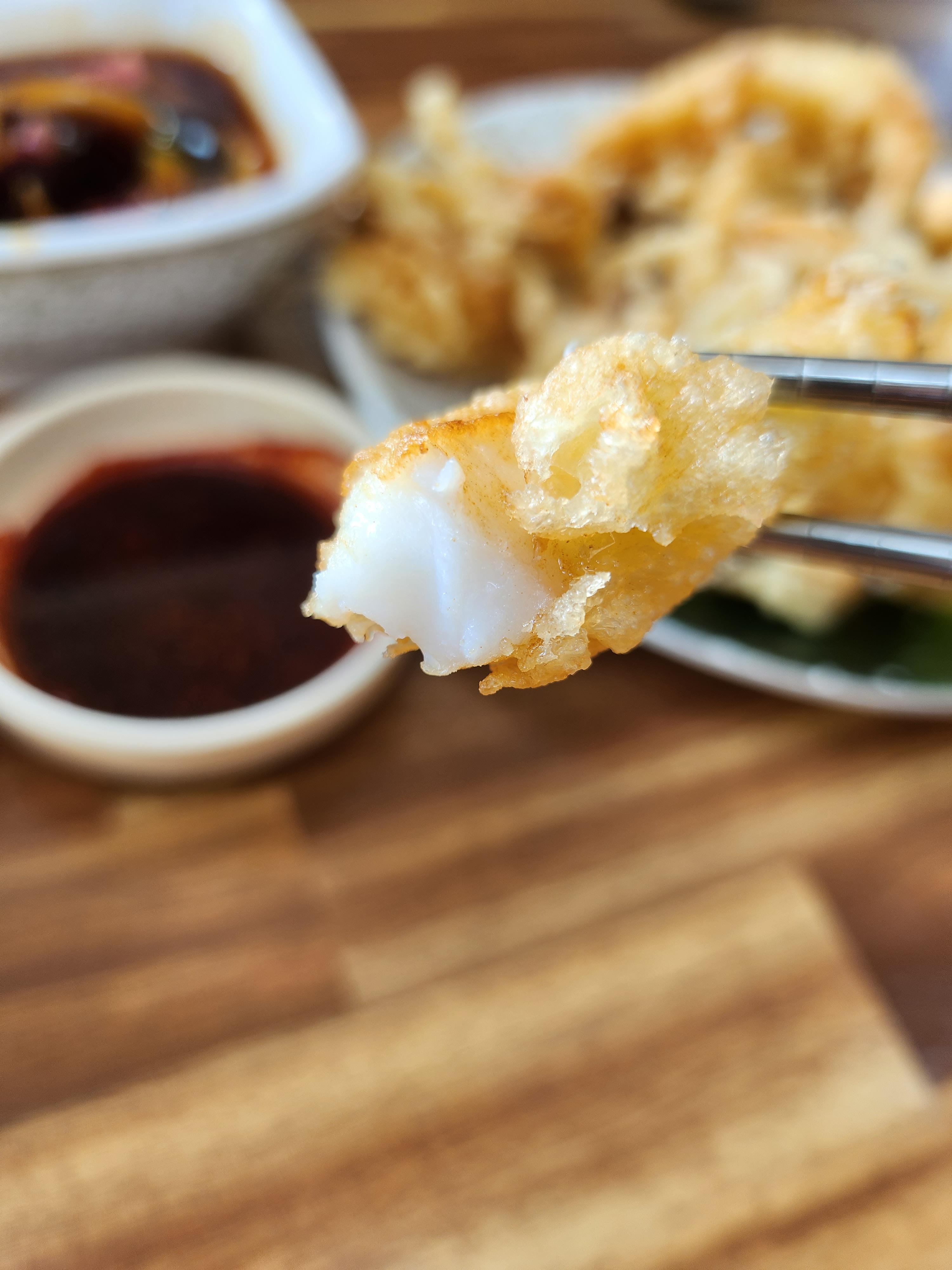 한입 베어 먹은 후 찍은 모습인데 갑오징어를 정말 아낌없이 두툼하게 튀긴 모습입니다.