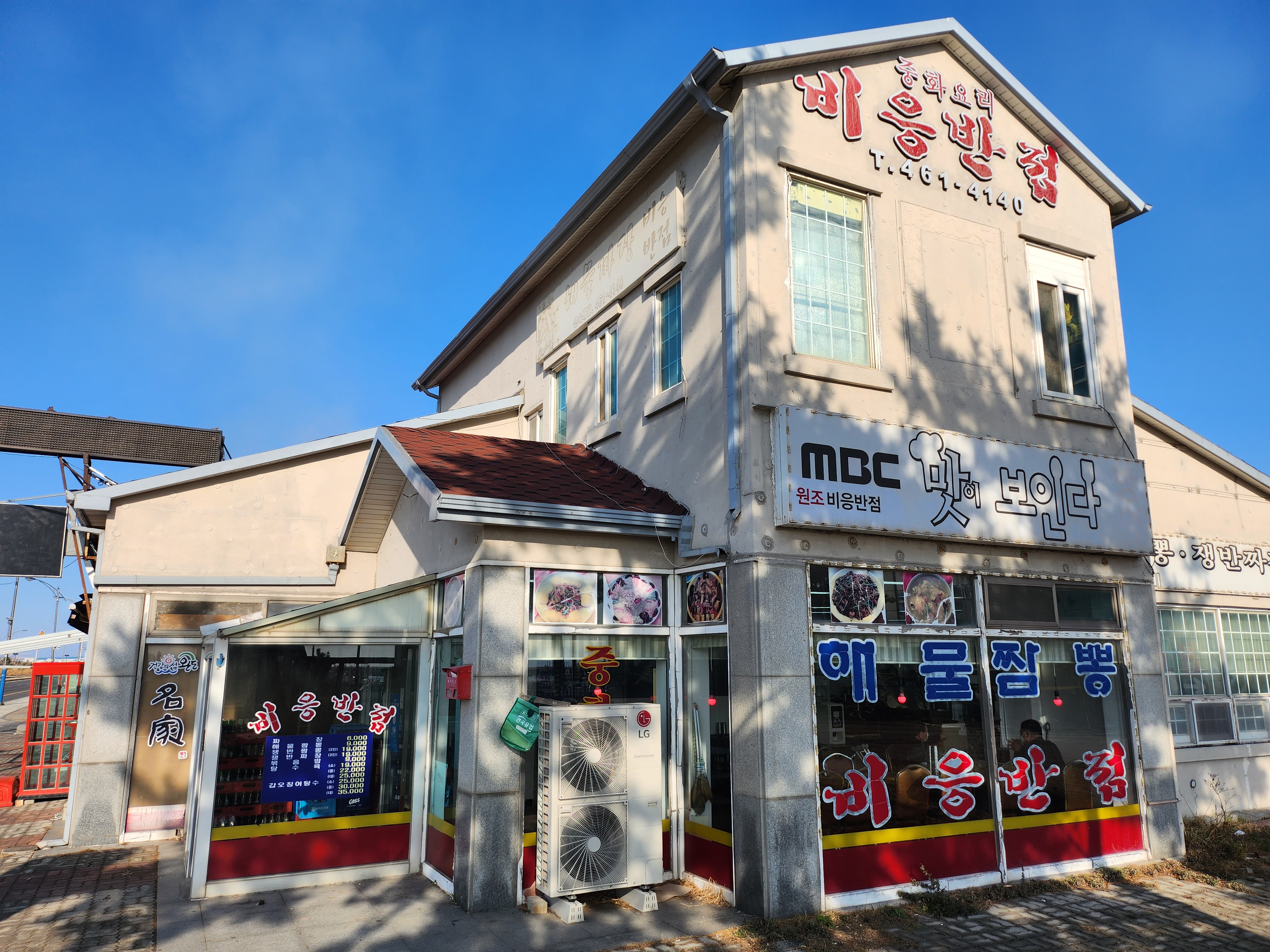 비응반점 외부 모습입니다. 주차장이 별도로 마련되어 있지는 않습니다. 다만 가게 앞쪽에 차량을 주차할 수 있는 공간이 있고 주변에 주차가능한 곳이 많이 있습니다. 입구에는 짬뽕의 명가라고 쓰여 있고 갑오징탕수육이 정말 많이 기대되었습니다.