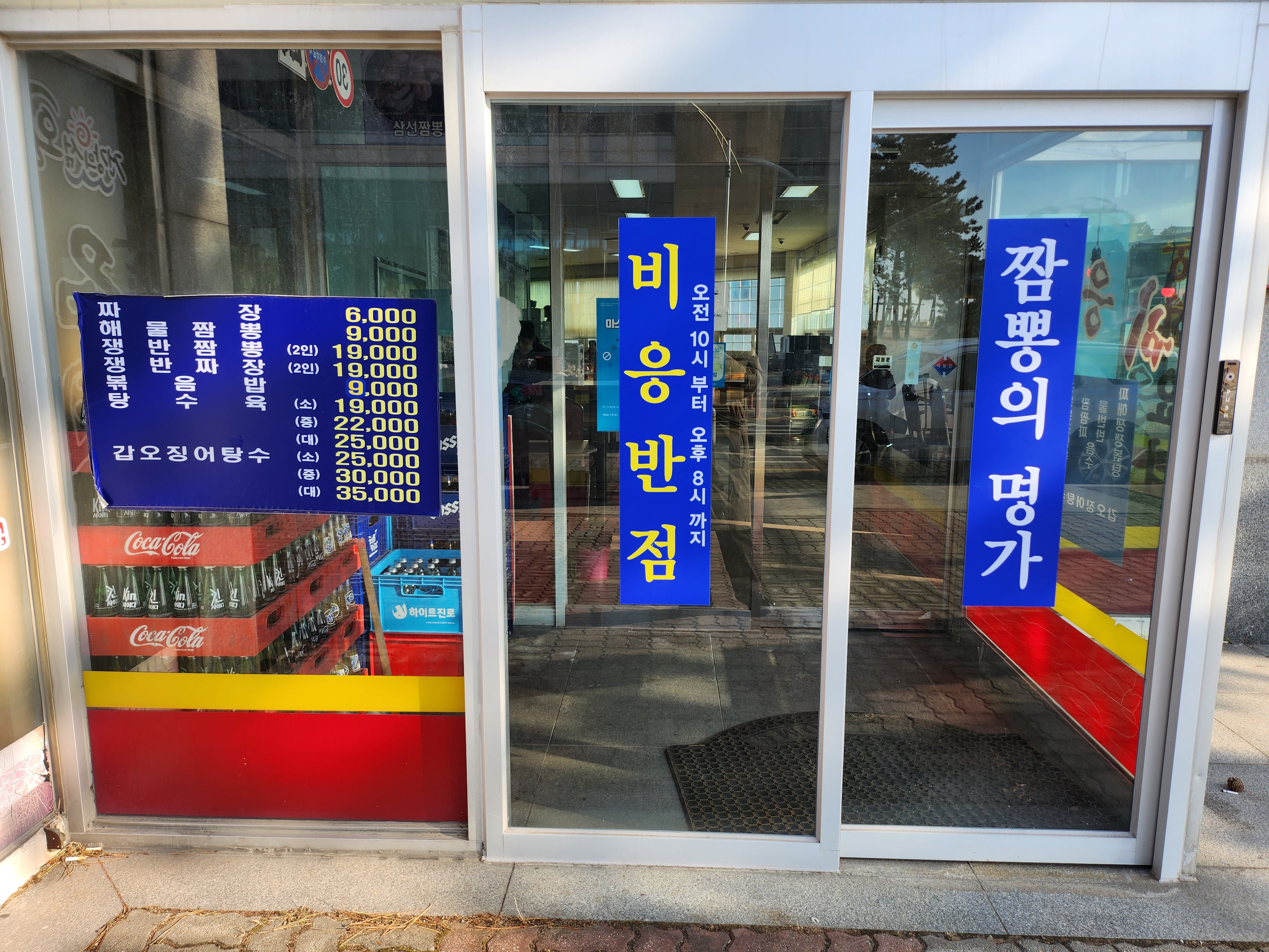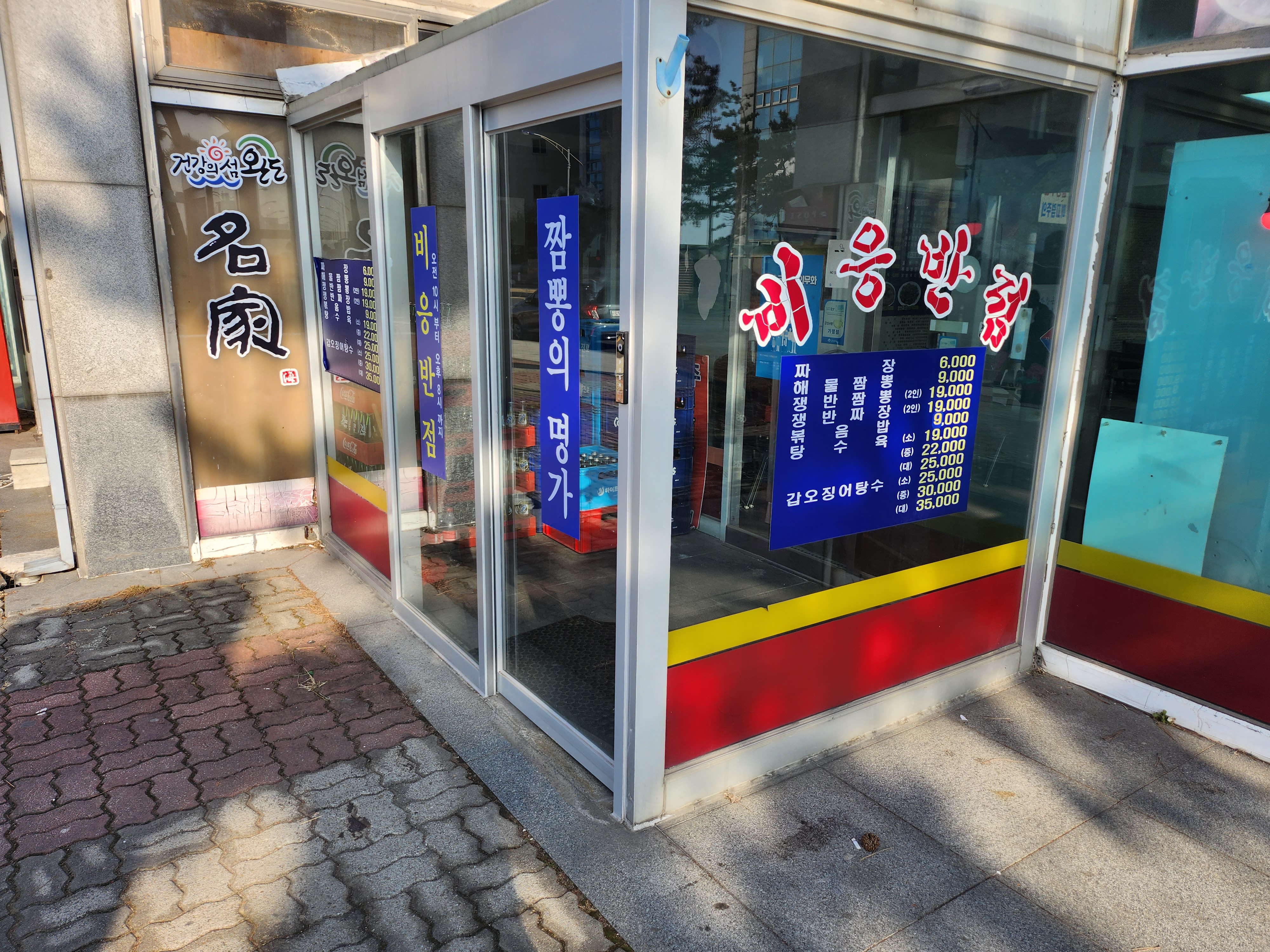 비응반점 외부 모습입니다. 주차장이 별도로 마련되어 있지는 않습니다. 다만 가게 앞쪽에 차량을 주차할 수 있는 공간이 있고 주변에 주차가능한 곳이 많이 있습니다. 입구에는 짬뽕의 명가라고 쓰여 있고 갑오징탕수육이 정말 많이 기대되었습니다.