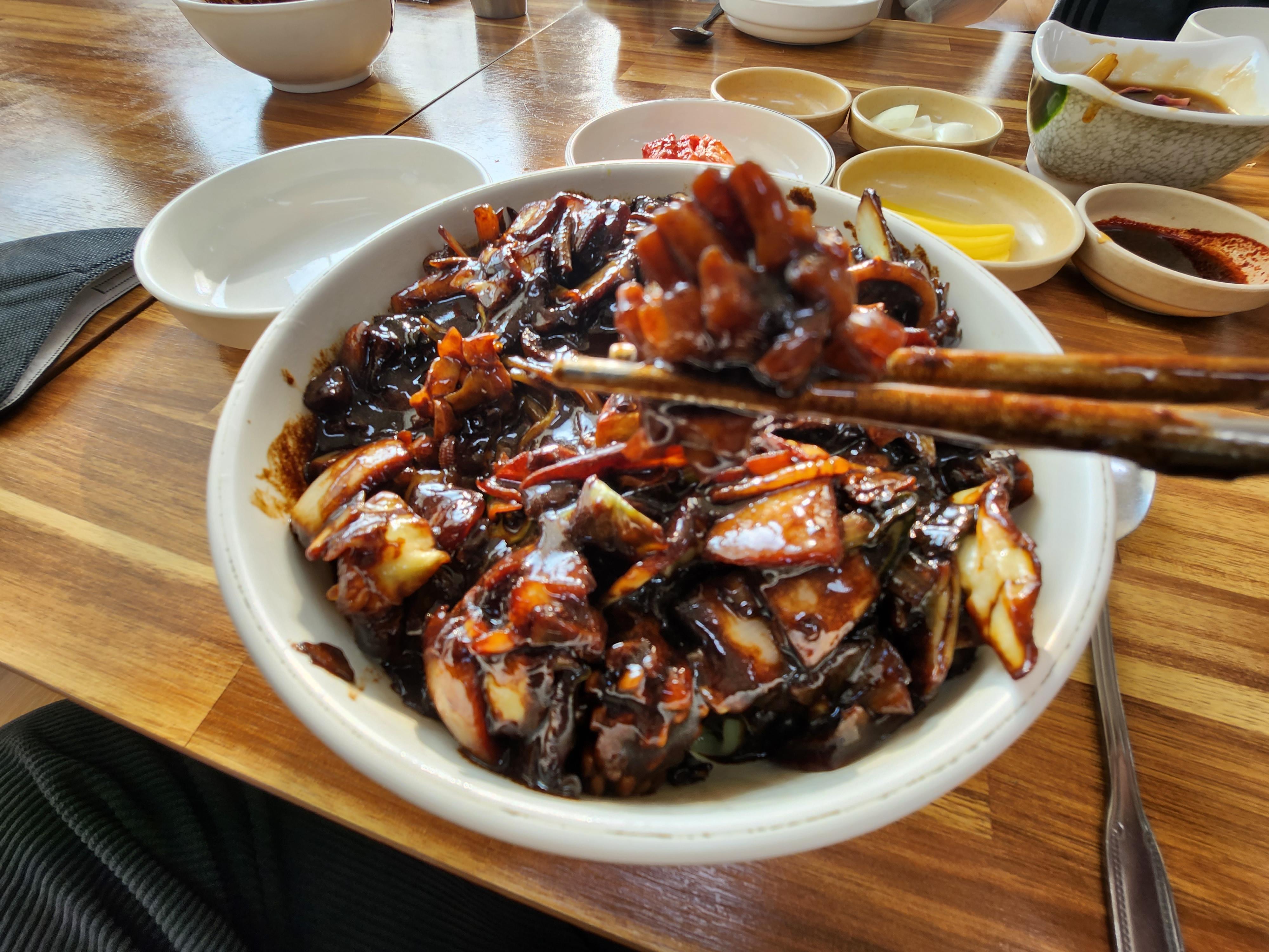 잘 비벼진 간짜장을 한입 먹어보니 싱싱한 해산물이 어우러져 고소하고 단짠단짠 맛입니다.