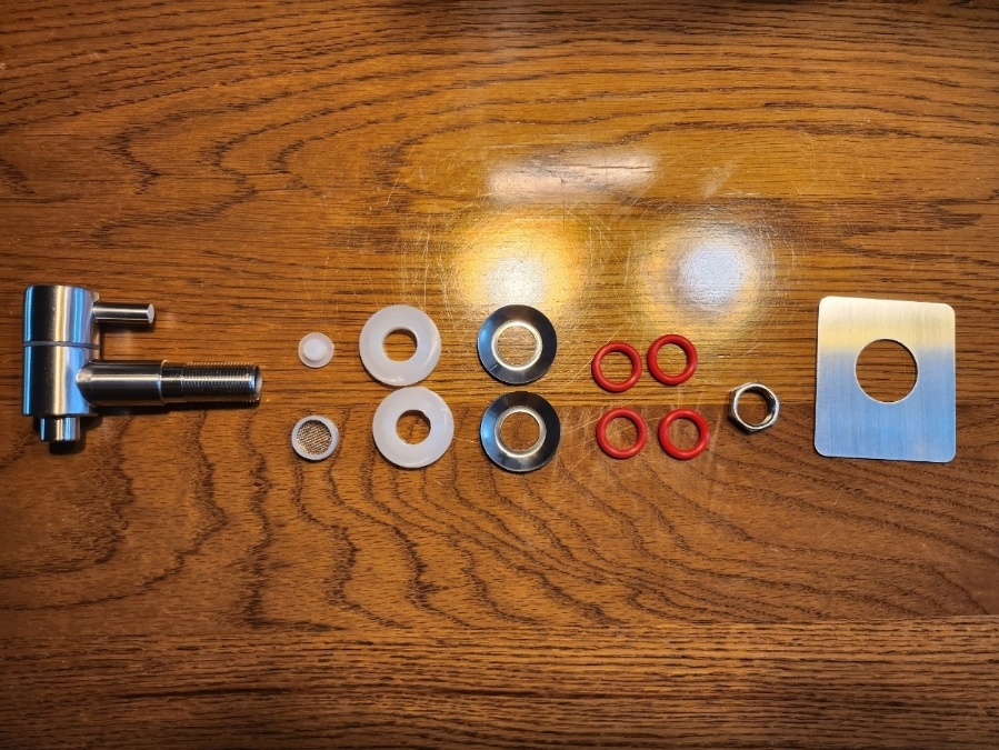 왼쪽부터 수도꼭지 로비넷 본체, 꼭지 마개와 거름 마개, 실리콘 2, 캡 2, 실리콘 링 4, 너트, 패널, 렌치입니다.