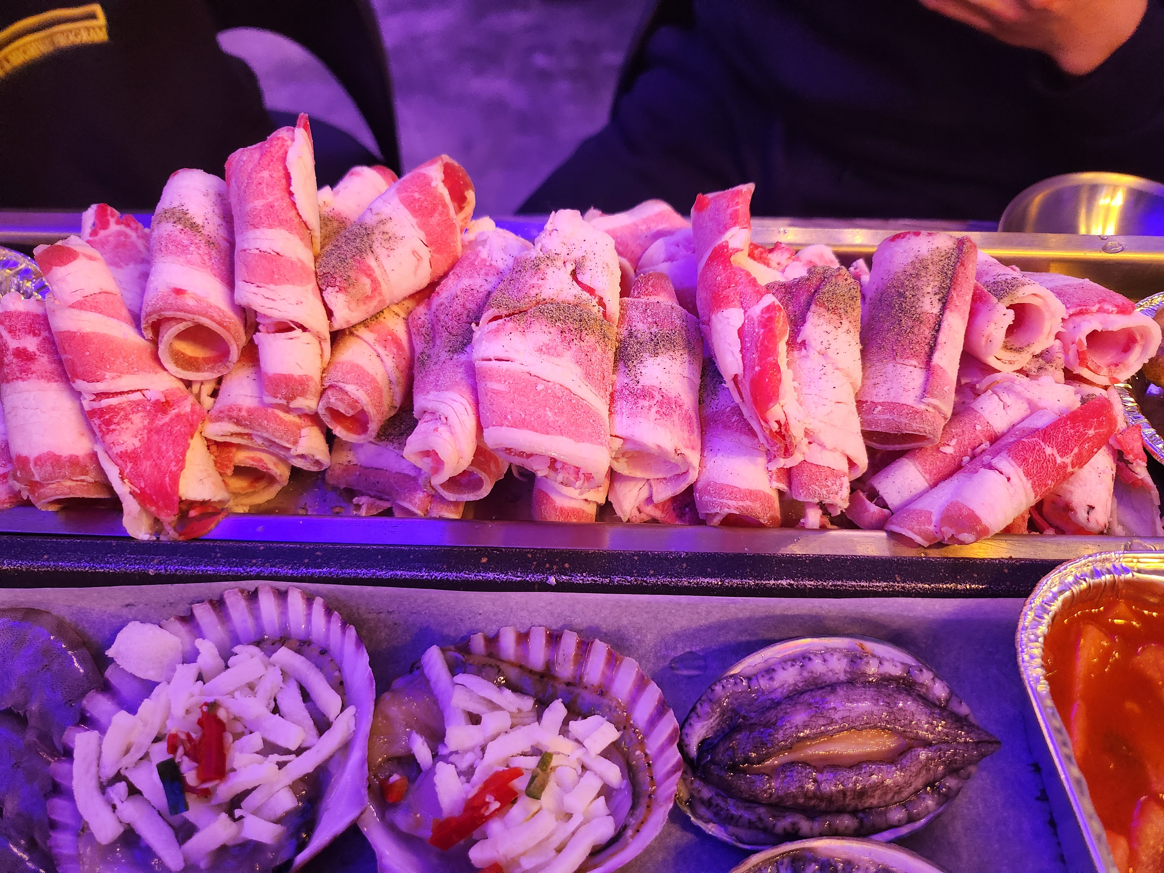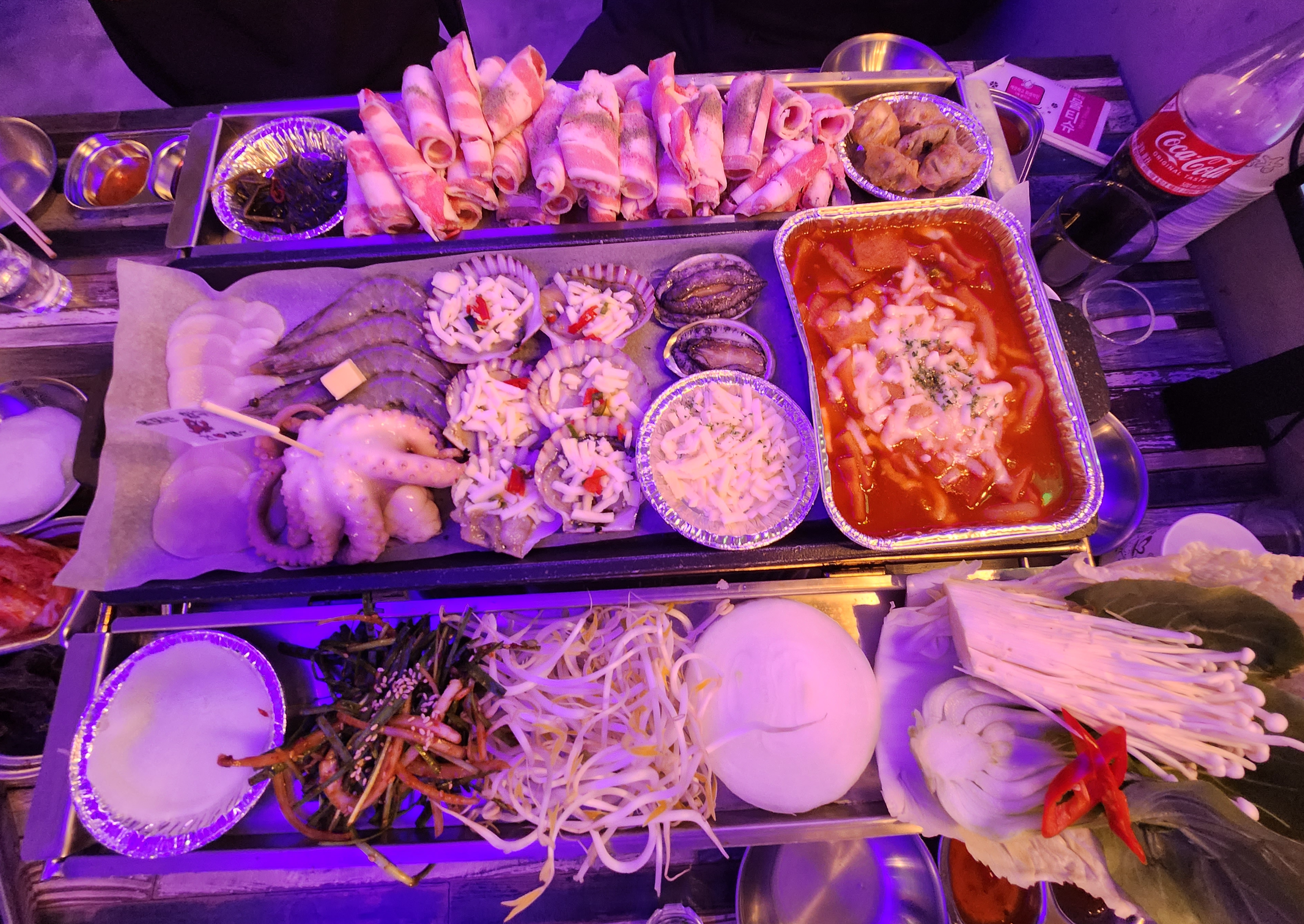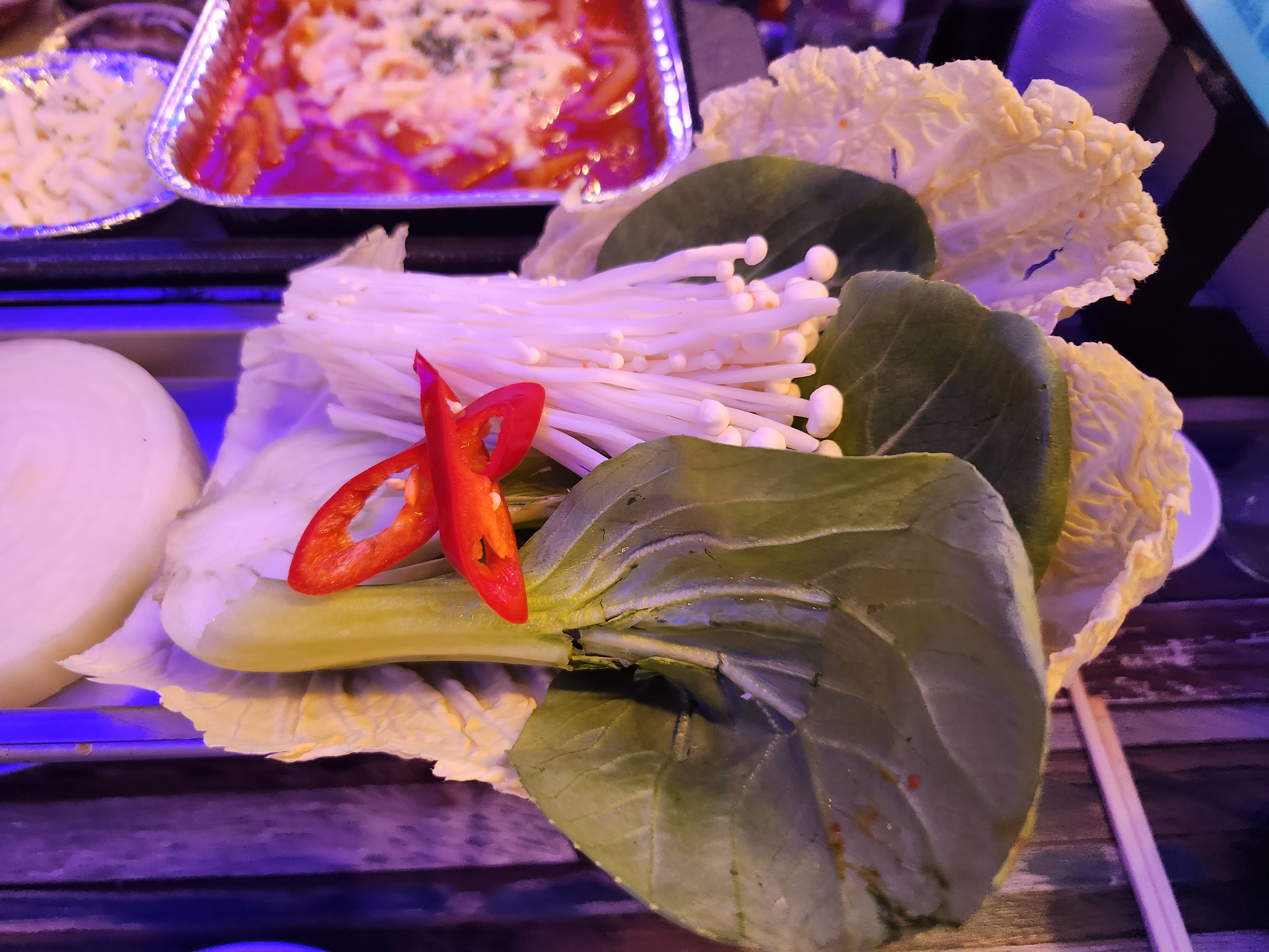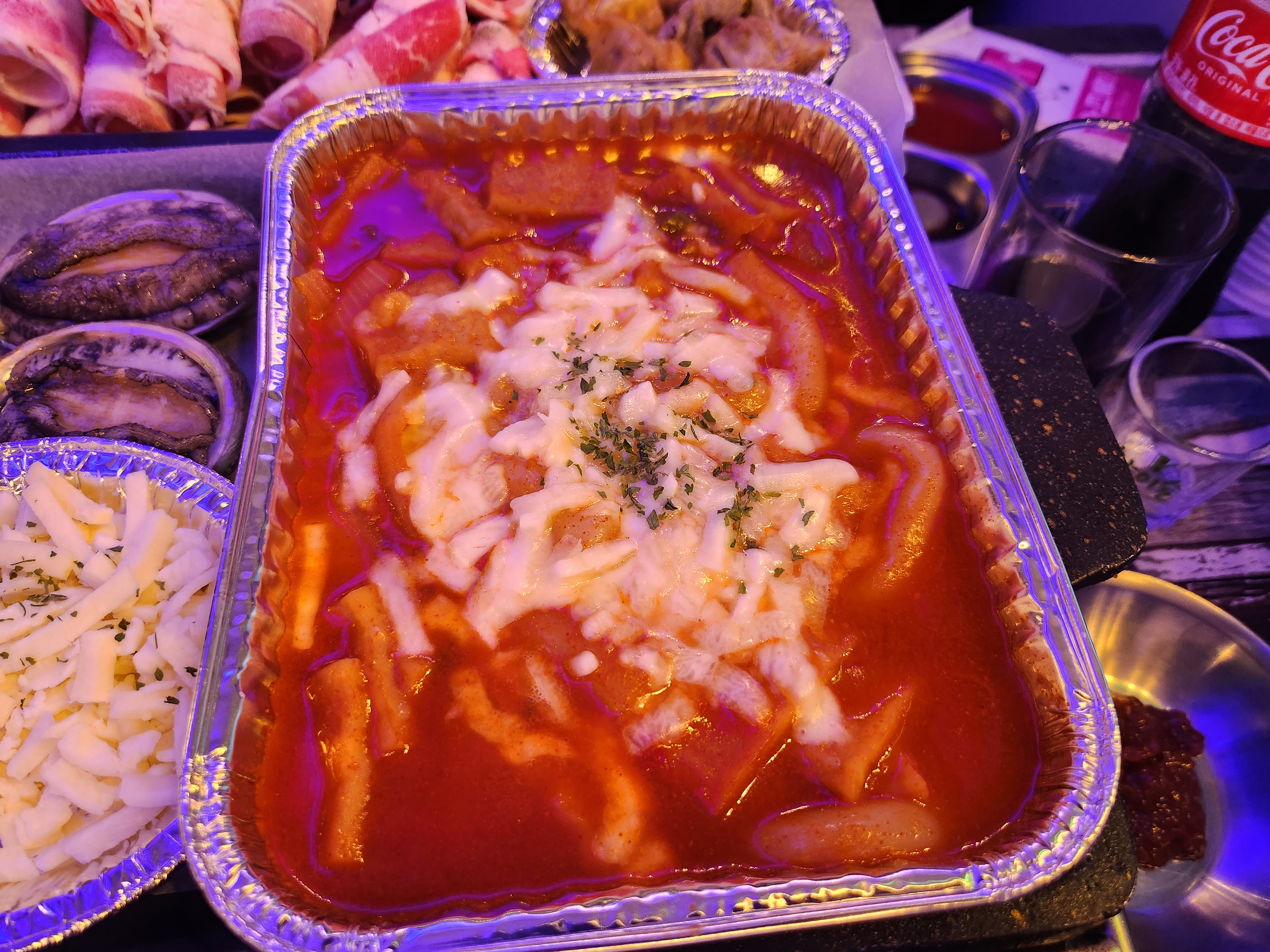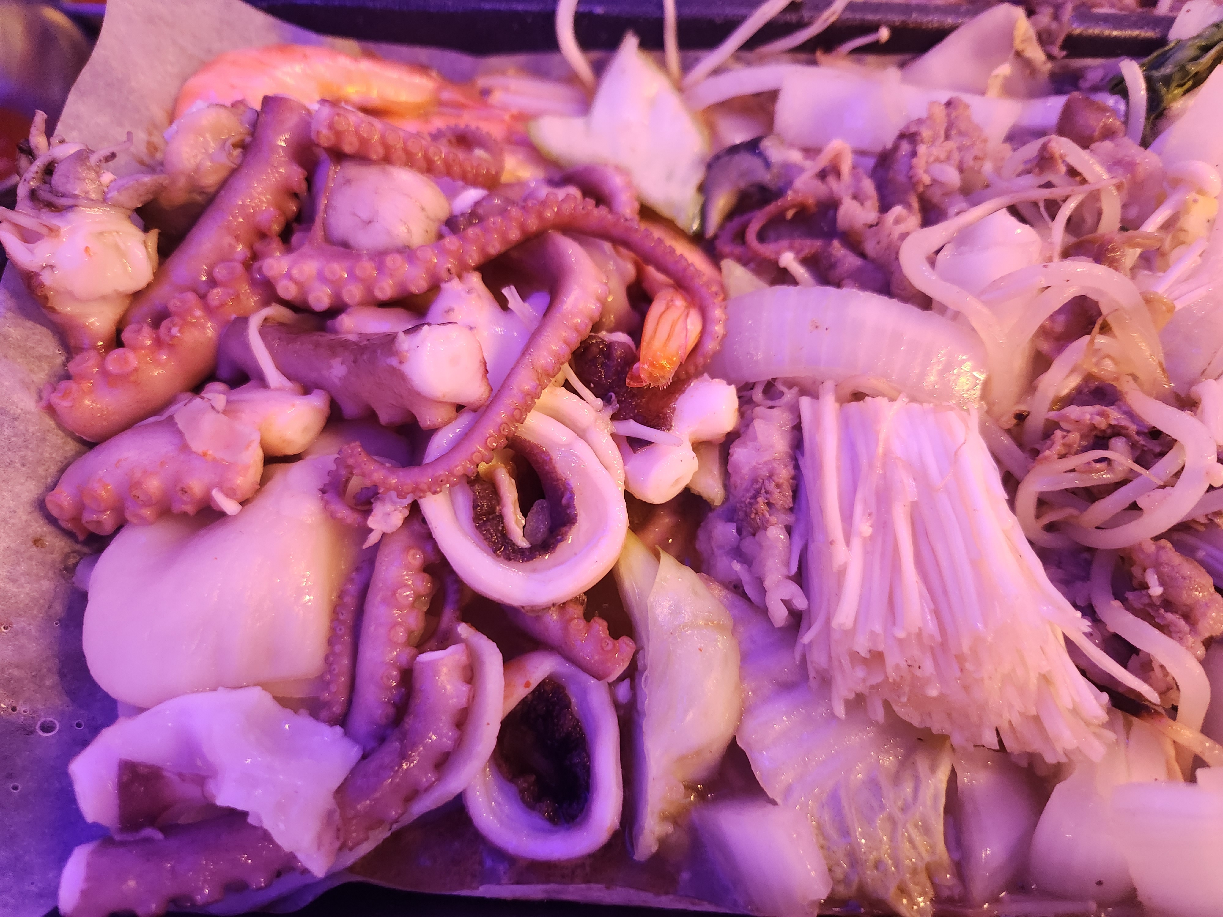 전체적인 구성은 치즈떡뽁이, 치즈가리비구이, 낙지, 새우, 키조개 관자, 우삼겹, 물만두튀김, 그리고 야채들로 구성되어 있습니다. 보는 것만으로 풍성한 구성임을 알 수 있습니다.