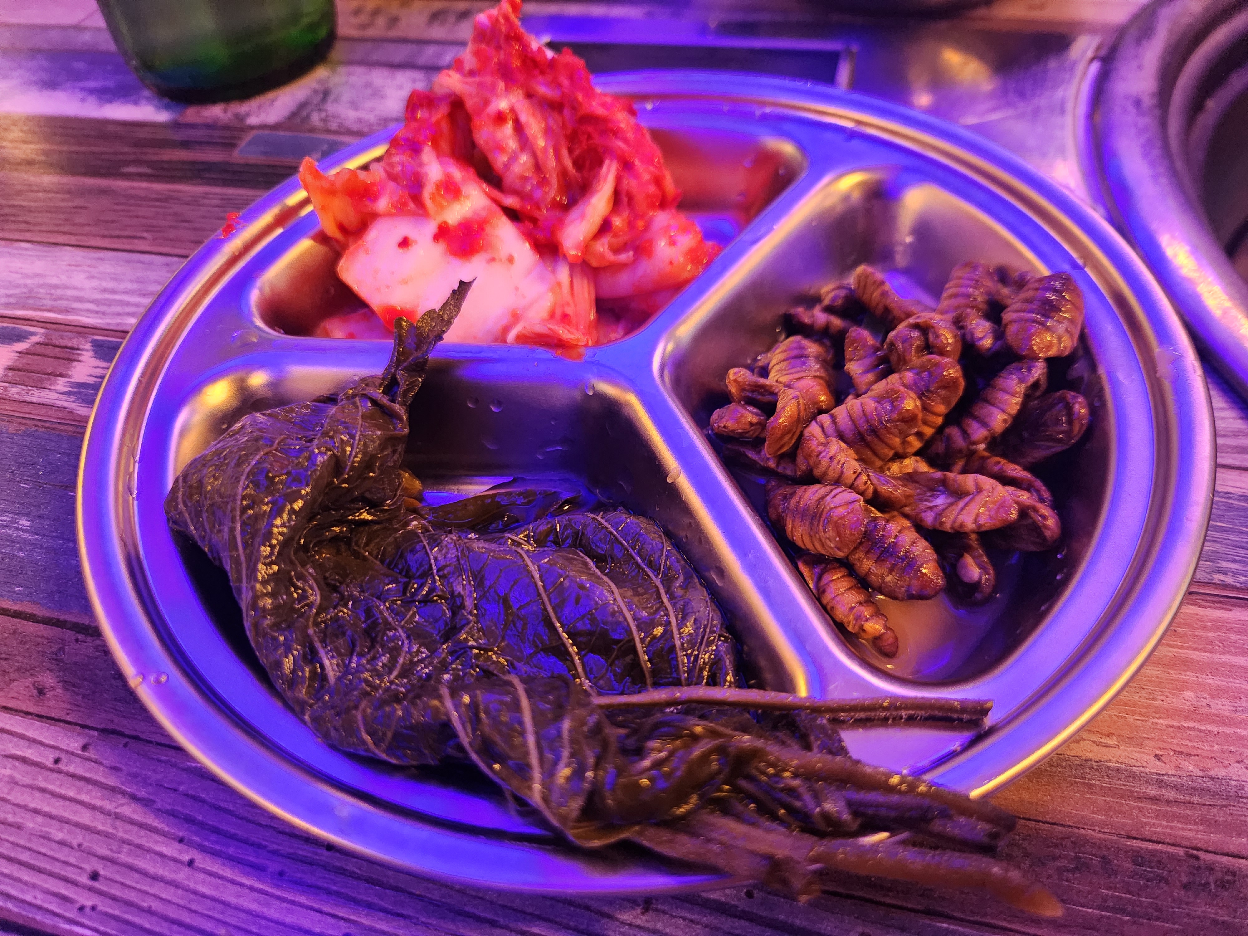 기본 반찬은 셀프로 가져다 드시면 되며, 김치, 번데기, 깻잎 장아찌, 무절임이 있었습니다.