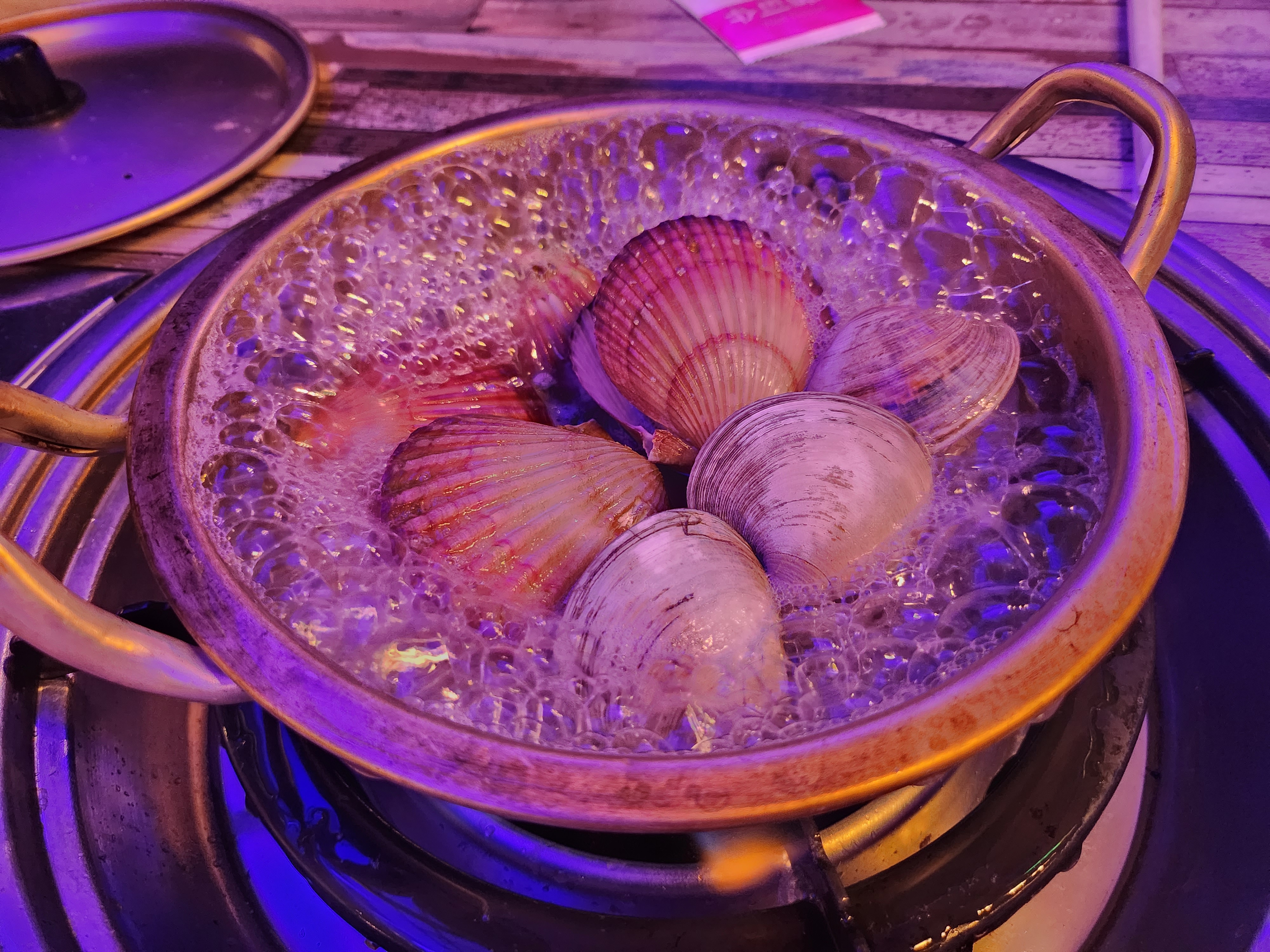 메뉴를 주문하니 양은 냄비를 하나 가져다주셨는데 기본으로 서비스를 주시는데 백합과 가리비가 들어있었네요. 냄비에 펄펄 끓어 잘 익혀진 백합과 가리비를 먼저 초장에 찍어 한잔 먹으니 기분이 좋아졌습니다. 백합과 가리비의 크기는 작은 편입니다.
