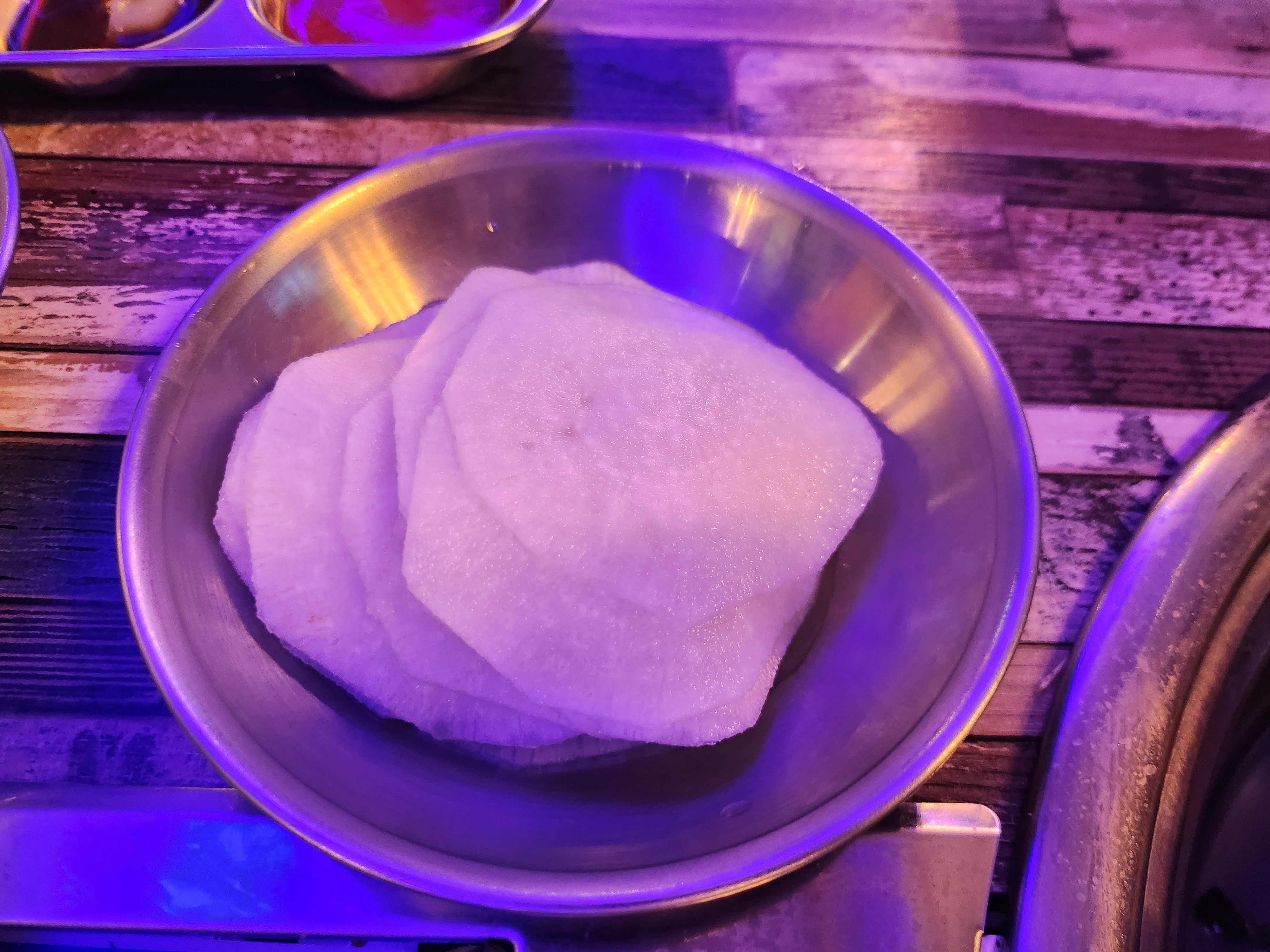 메뉴를 주문하니 양은 냄비를 하나 가져다주셨는데 기본으로 서비스를 주시는데 백합과 가리비가 들어있었네요. 냄비에 펄펄 끓어 잘 익혀진 백합과 가리비를 먼저 초장에 찍어 한잔 먹으니 기분이 좋아졌습니다. 백합과 가리비의 크기는 작은 편입니다.