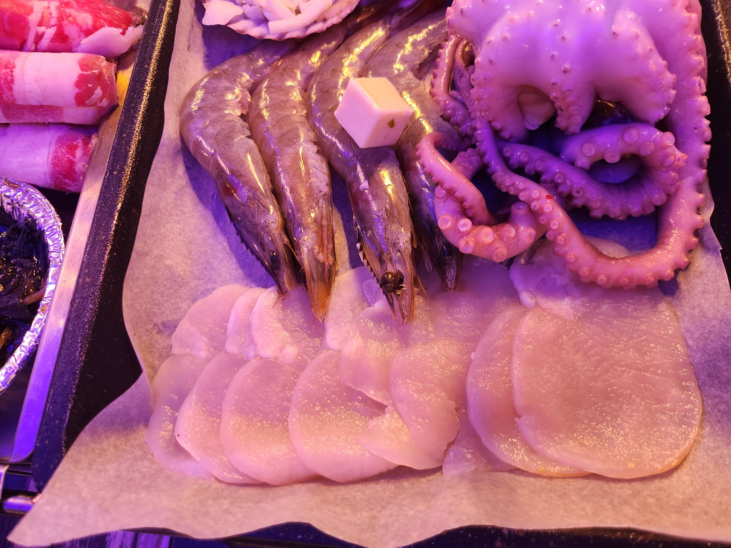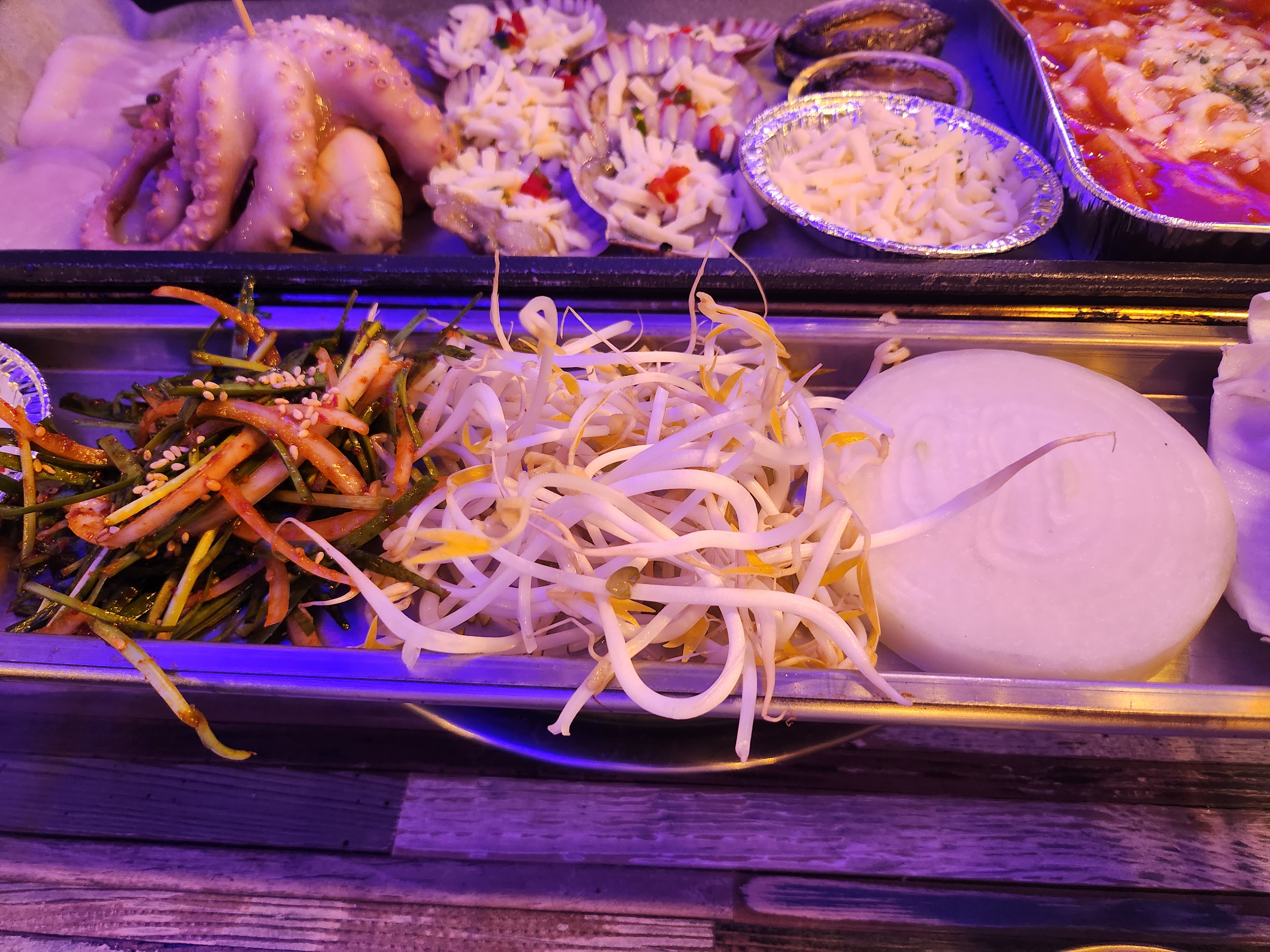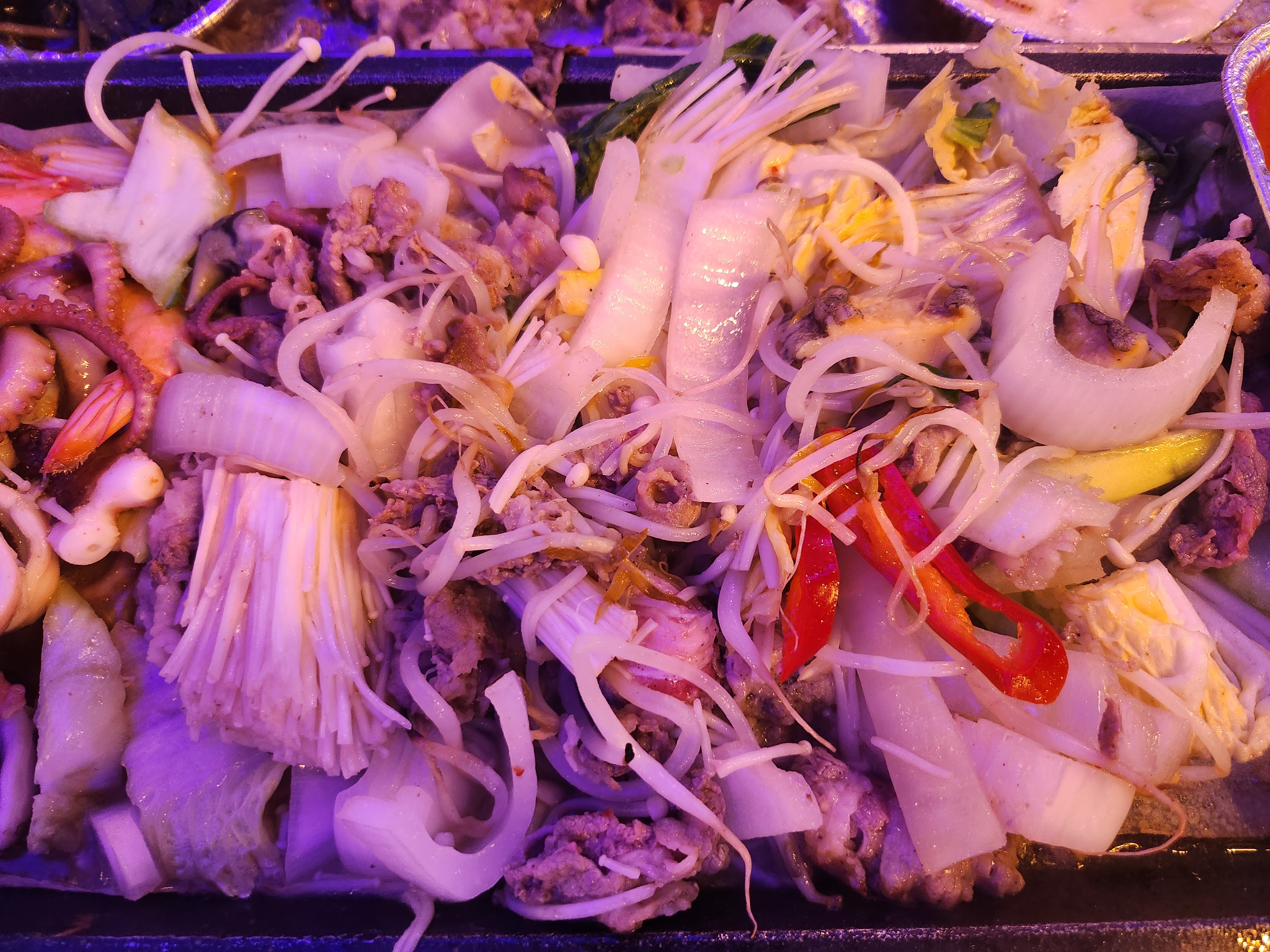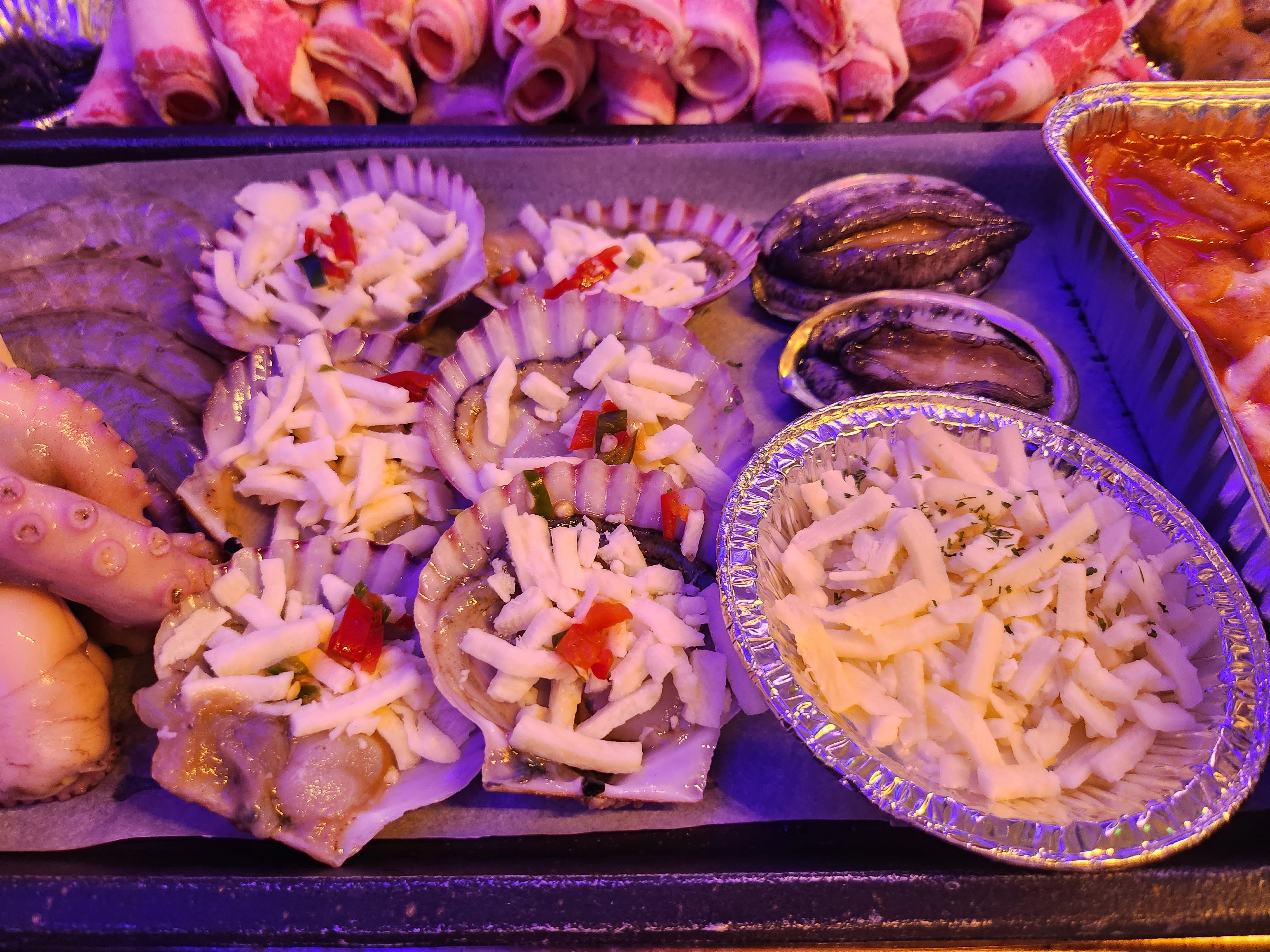전체적인 구성은 치즈떡뽁이, 치즈가리비구이, 낙지, 새우, 키조개 관자, 우삼겹, 물만두튀김, 그리고 야채들로 구성되어 있습니다. 보는 것만으로 풍성한 구성임을 알 수 있습니다.