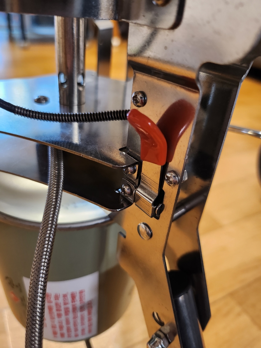 점화 버튼(빨간색)입니다. 가스를 틀고 아래쪽으로 내리면 딸깍 소리가 나면서 점화가 되는 구조입니다.