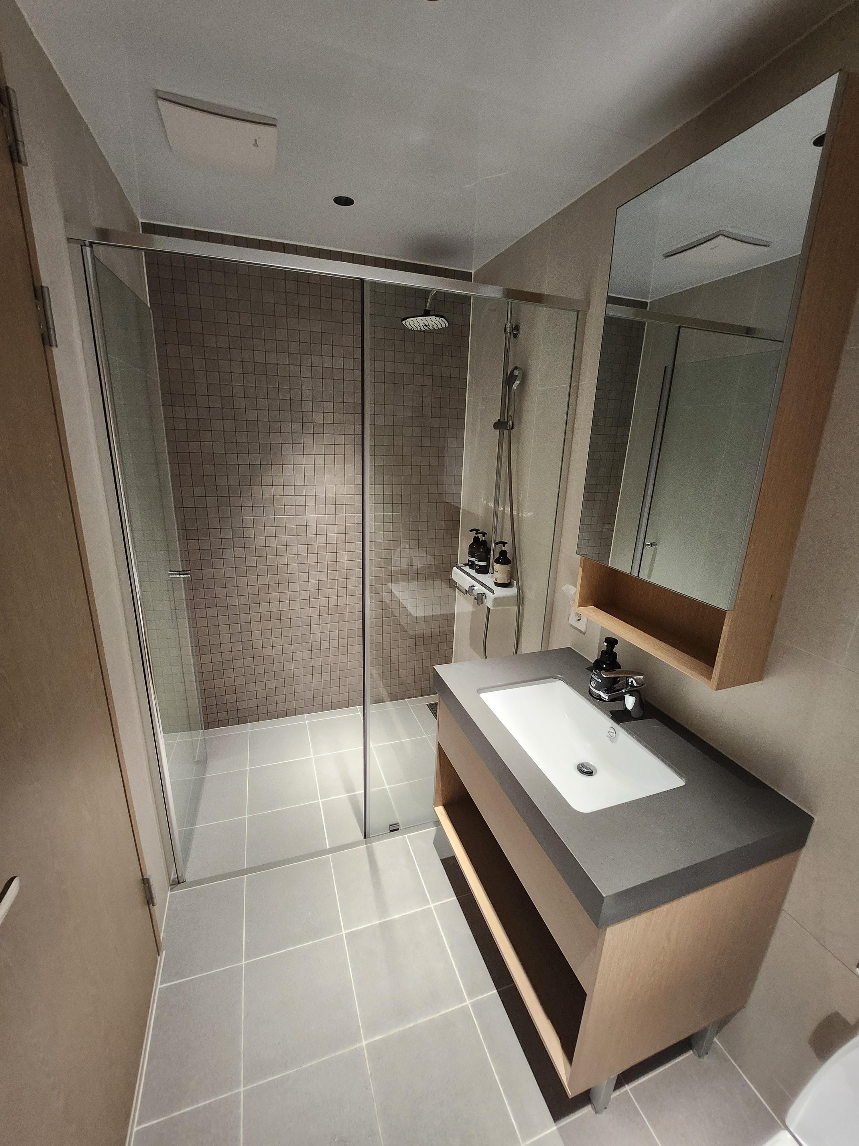 핸드워시, 샴푸, 린스, 바디워시와 화장실장안에 헤어드라이어는 준비되어 있었고 칫솔, 치약, 비누 등은 없으니 미리 준비하셔야 합니다. 환경보호를 위한 명분으로 1회 용품들은 아무것도 없네요. 비데는 미설치되어 있고 샤워부스 공간은 마련되어 있습니다. 화장실은전체적으로 깔끔한 모습입니다.