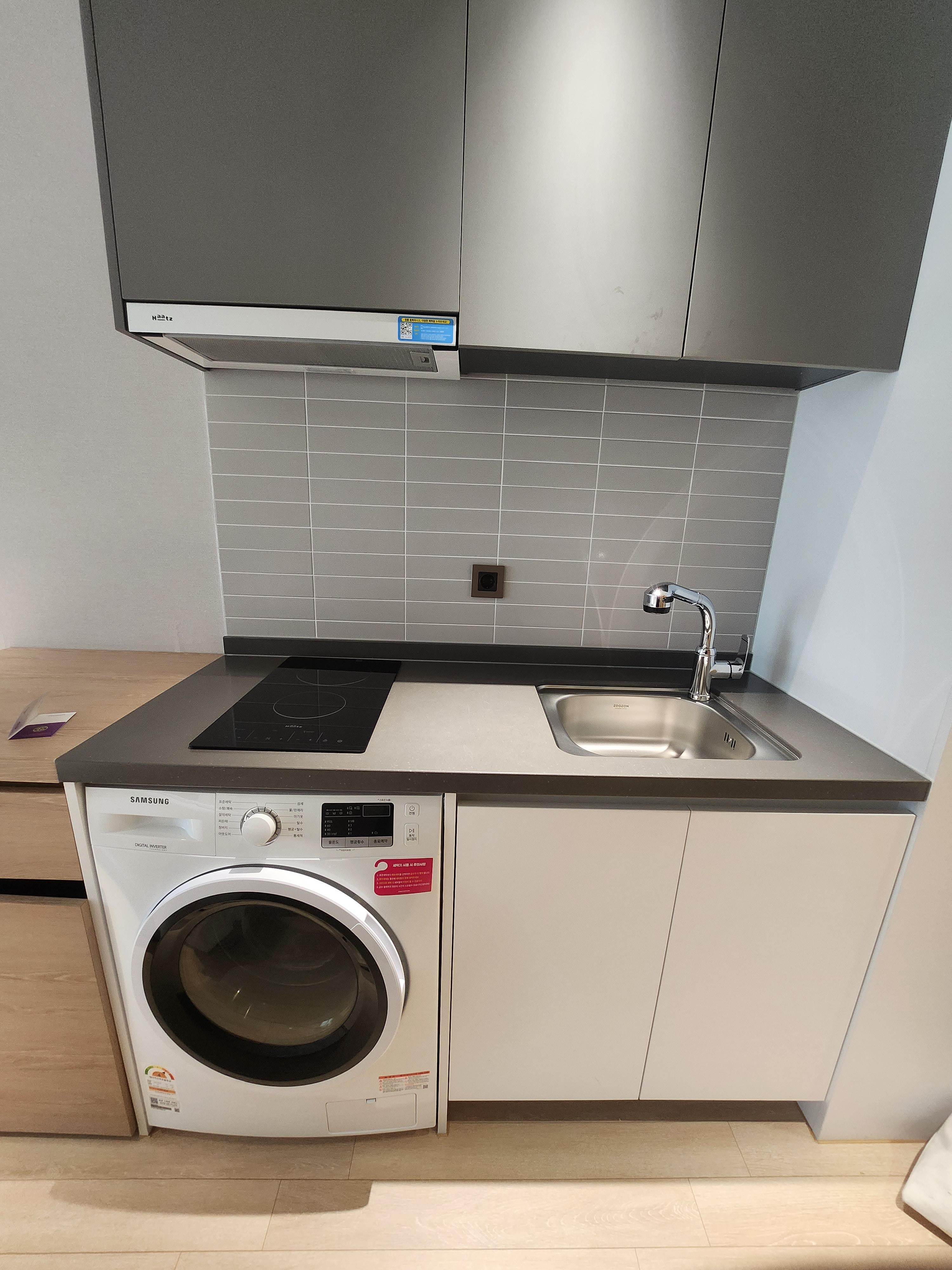 드럼세탁기와 인덕션 조리대가 준비되어 있지만 사용할 일이 없고 취사에 필요한 조리도구는 아무것도 없습니다. 취사나 조리는 불가능하고 흡연도 금지입니다. 이를 어길 경우에는 추가요금을 요구 발생될 수 있으니 주의가 필요합니다. 준비되어 있는 미니 냉장고는 매우 작은 사이즈로 간단한 맥주나 음료정도 가져가서 보관할 수 있습니다. 만약 음식을 조리해서 먹어야 하는 상황이라면 요리공작소라는 공유주방 시설이 B동 1층에 마련되어 있으니 1인당 5천을 내고 이용하시면 되고 밀키트도 다양하게 판매되고 있었습니다.