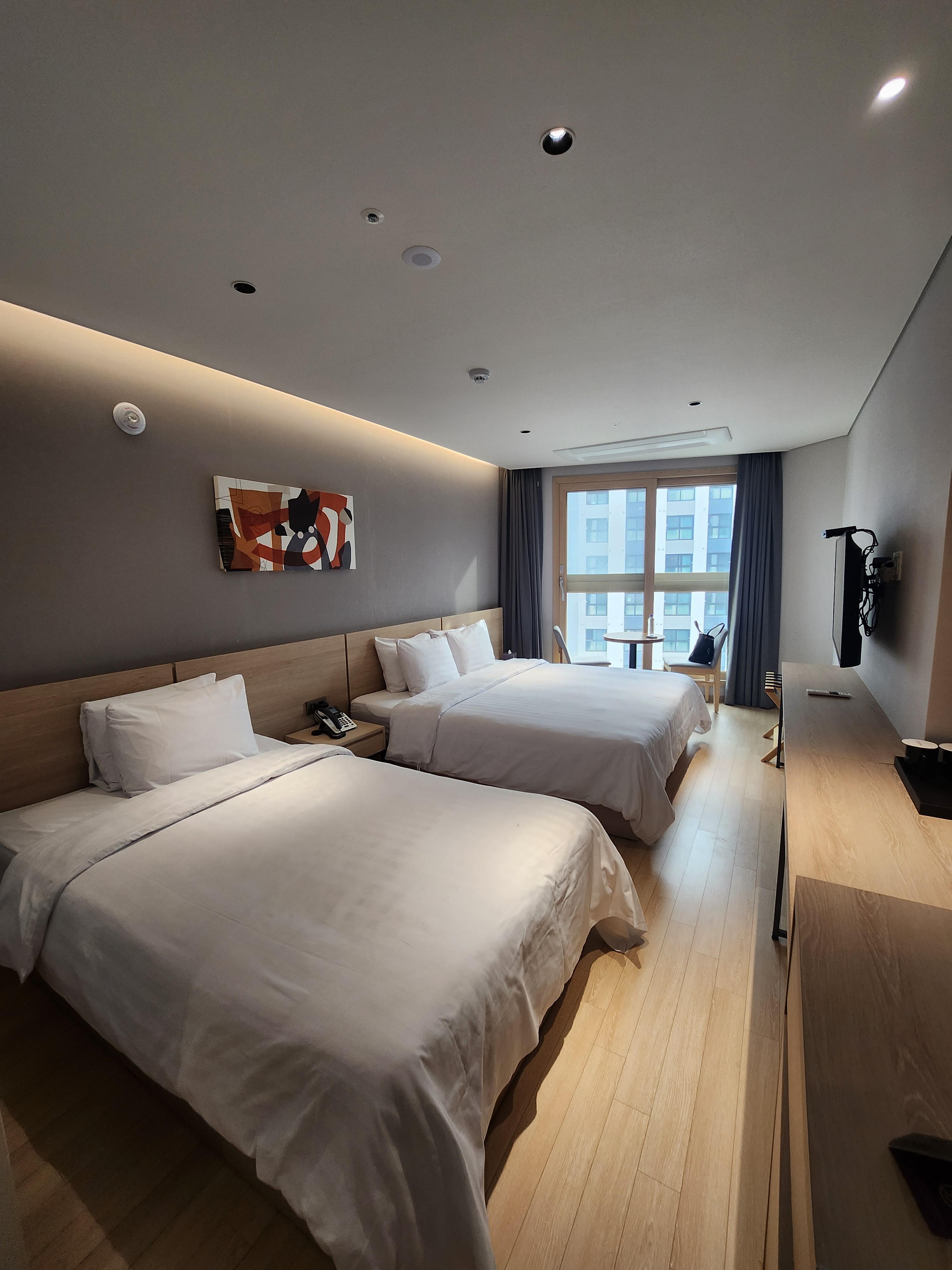 저희 가족은 3인 원룸 패밀리 트윈을 예약했고 침대는 슈퍼싱글 침대와 킹라지 침대로 구성된 객실이었습니다. 사전에 비대면 입실이 가능해서 모바일 커넥트 앱을 핸드폰에 설치한 후 여러 번 체크인을 시도했지만 여러 번 실패한 끝에 로비로 다시 내려가 체크인을 한 후 카드를 수령해서 입실할 수 있었습니다. 요즘 모텔들도 비대면 모바일 입장이 수월하게 잘 되고 있는데 어느 정도 규모를 갖추고 있는 호텔임에도 불구하고 잘 동작되지 않는 점은 상당히 문제가 있다고 보입니다. 저희뿐만 아니고 다른 집들도 마찬가지였으니까요.