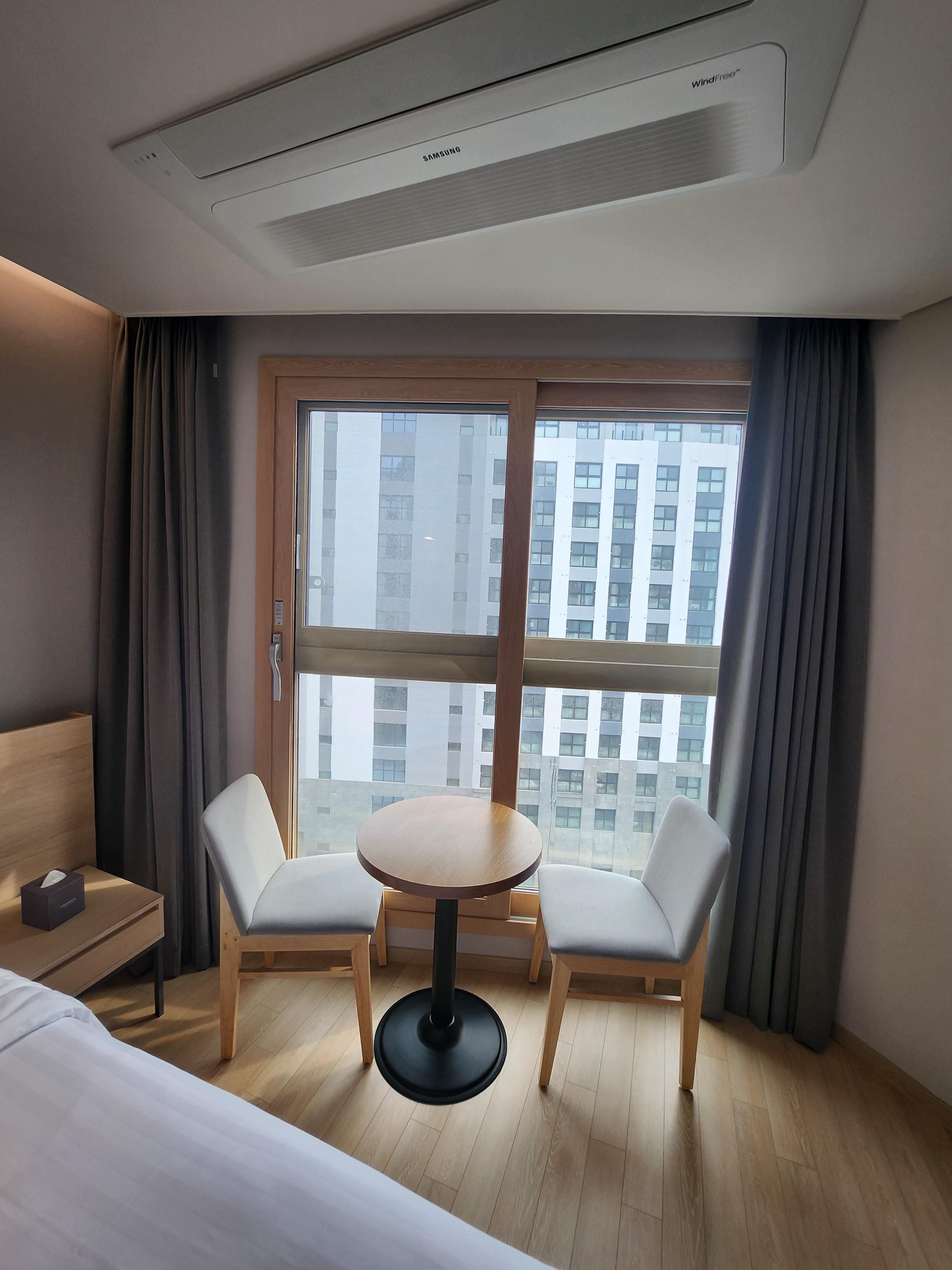 객실 바깥 창문 쪽에 별도의 베란다는 없고 2중 새시 구조로 밖을 내다볼 수 있고 조그마한 원형테이블과 의자가 준비되어 있습니다.