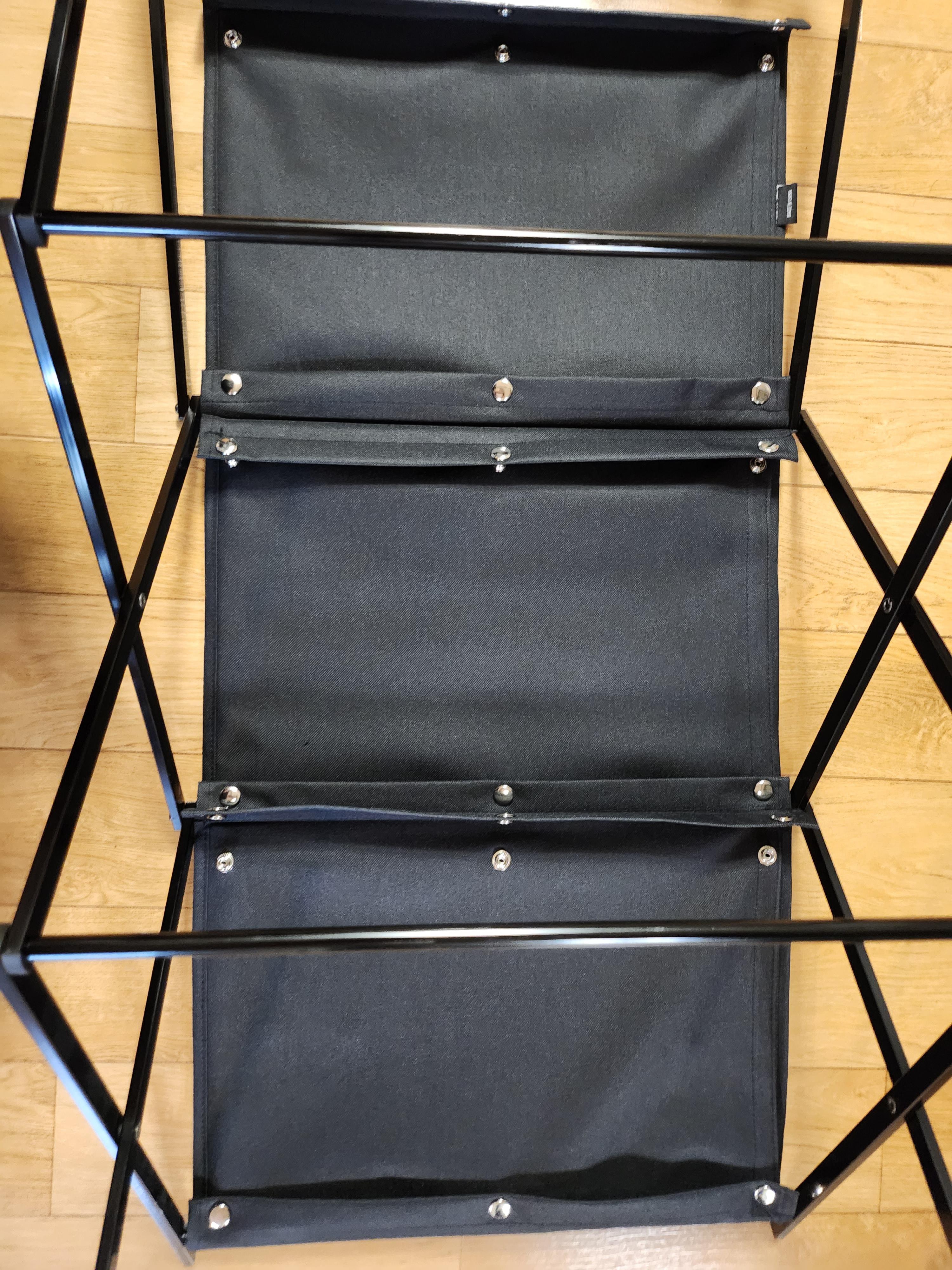 해체는 조립의 역순인데 쉘프의 똑딱이 단추들을 풀어 준 후 본체 부분을 살짝 밑으로 눌러주면 손쉽게 접히는 형태로 30초 내외로 정리가 가능했습니다. 기존에 우드 쉘프도 써봤는데 조립해체는 비슷한 반면 상판들은 더욱 튼튼하고 층별 높이도 조금 더 높아 활용이 더 좋았고 상단에는 행어 역할까지 겸비하고 있으니 다용도로 활용하기 수월합니다. 현재까지 나와있는 쉘프 중에는 제품의 퀄리티도 뛰어나고 가성비도 좋아 끝판왕급이라고 생각되네요. 궁금한 점 있으시면 댓글 남겨주세요.