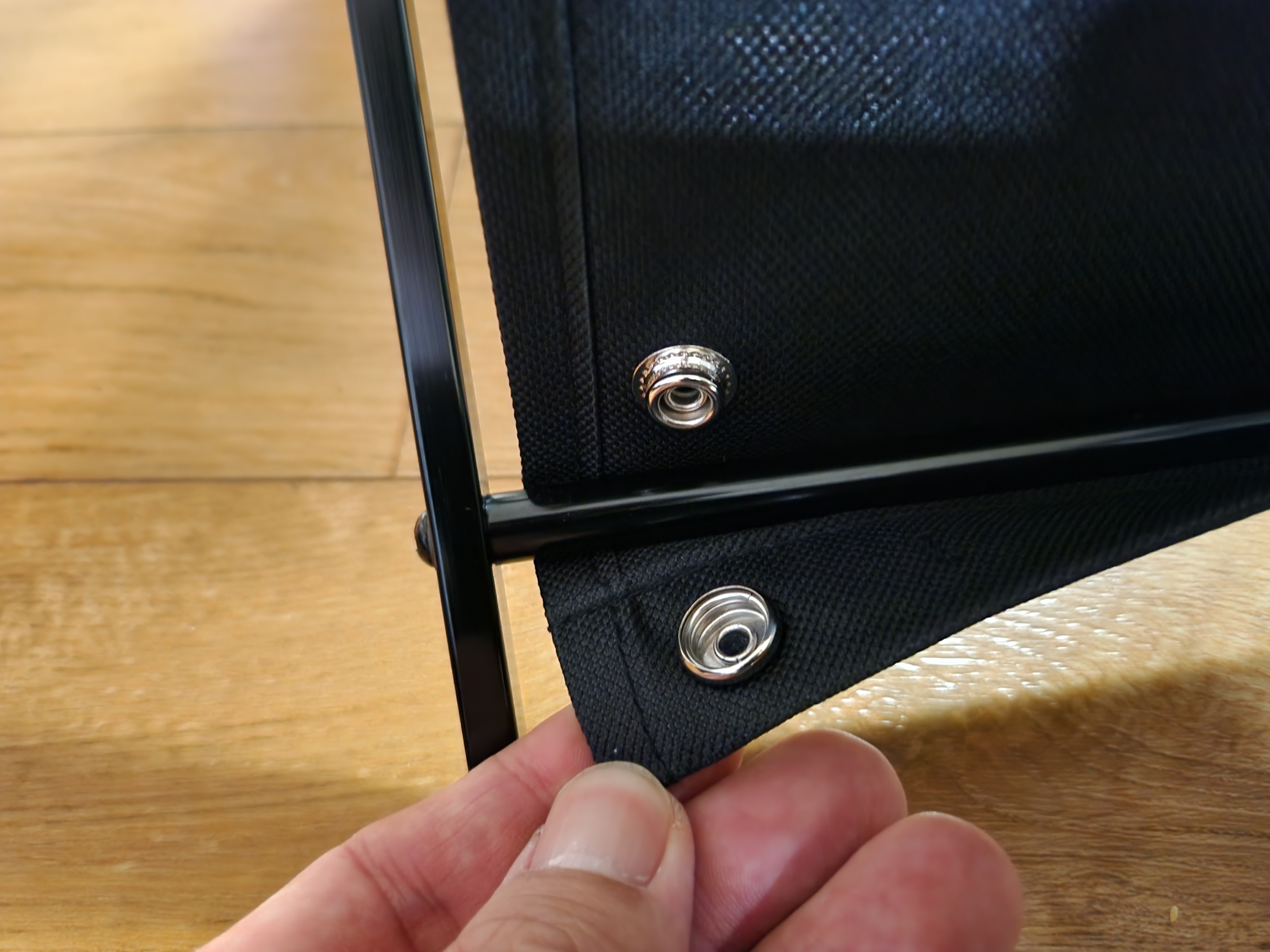 각 선반별로 3개의 똑딱이 단추를 손으로 눌러서 채워 줍니다. 각 선반 별로 똑딱이 단추를 전부 체결해 주면 됩니다.