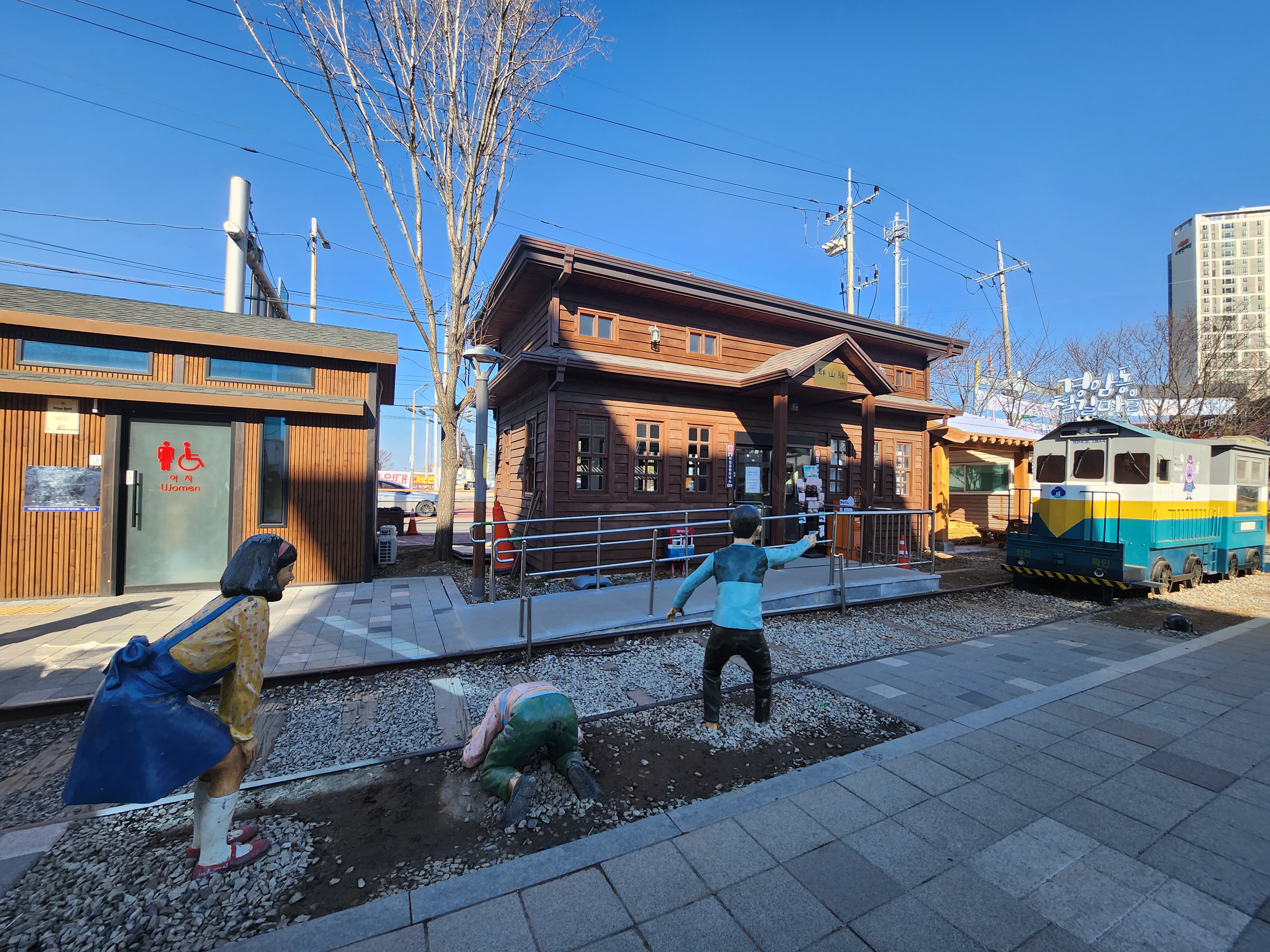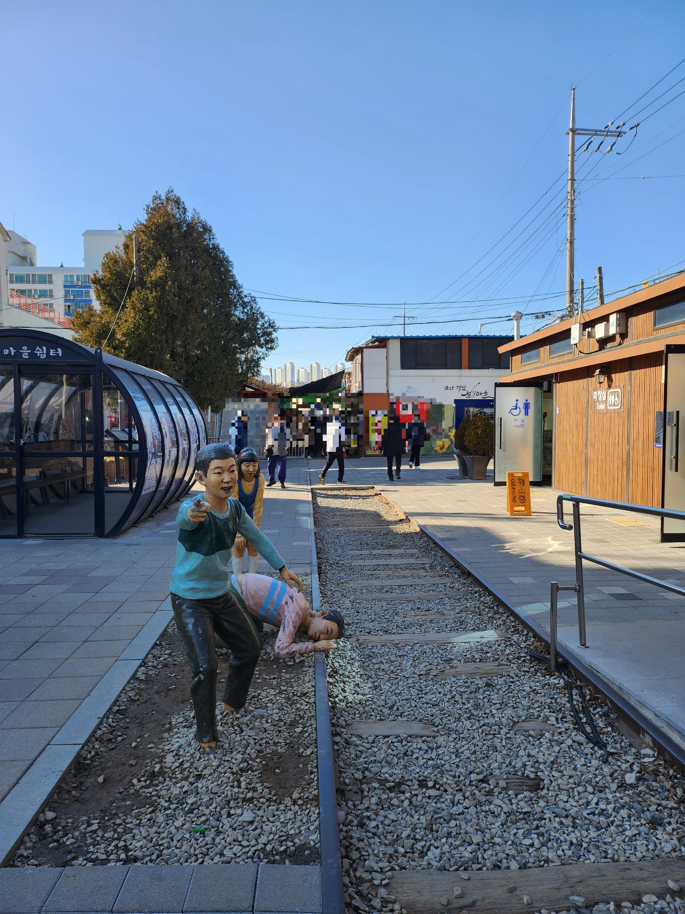 이곳은 연안사거리 쪽 경암동 철길 끝부분에는 쉼터와 화장실이 있습니다. 그리고 여러 가지 조형물들이 설치되어 있어 사진을 찍기에 좋은 장소입니다.