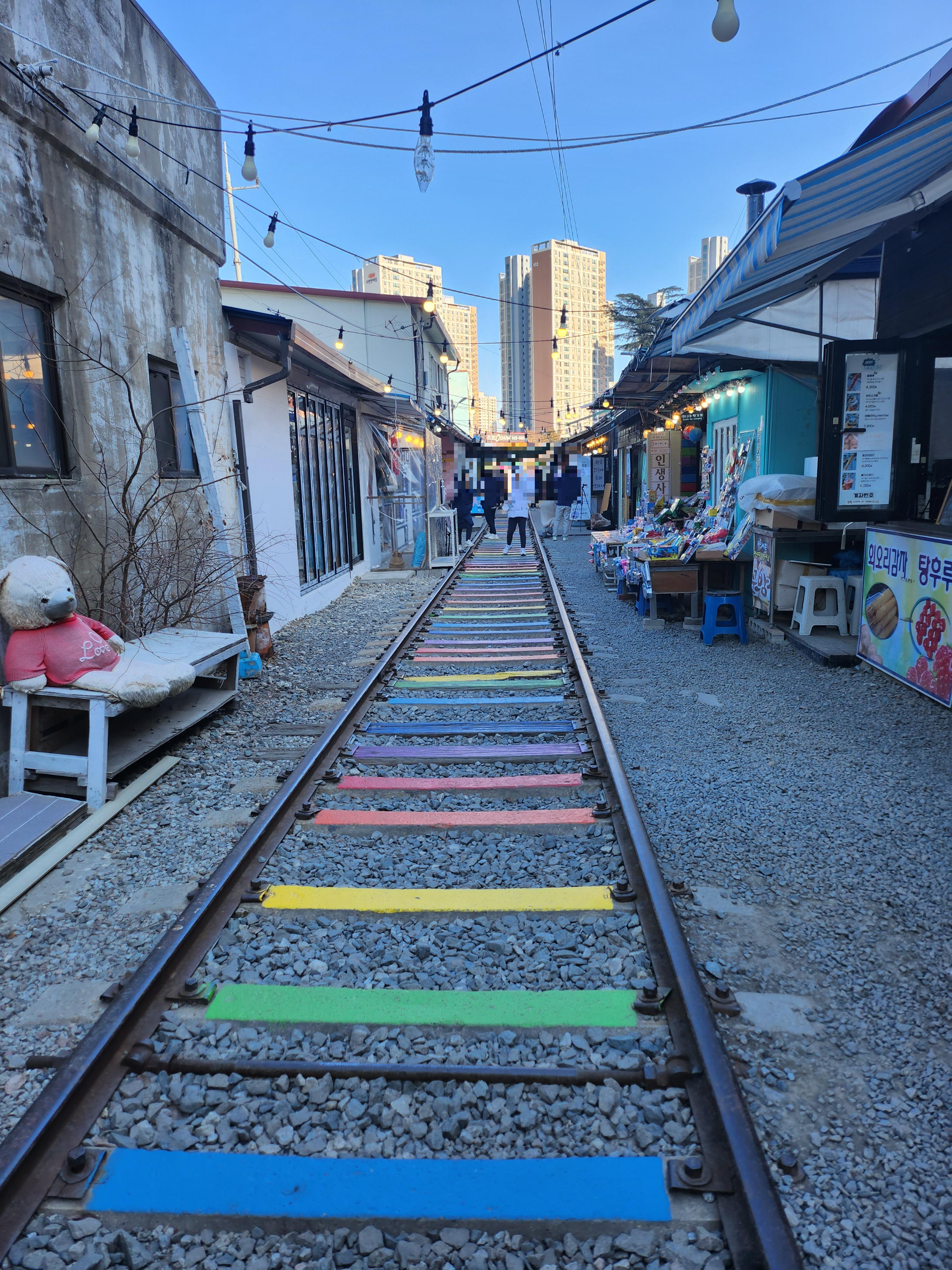 옛 철길에는 알록달록한 무지개 색을 이쁘게 입혀놨습니다. 과거의 일이긴 하지만 철길 주변에 마을이 형성되었고 집 바로 옆에 기차가 지나다녔던 철길이라니 이런저런 생각들이 들었습니다.