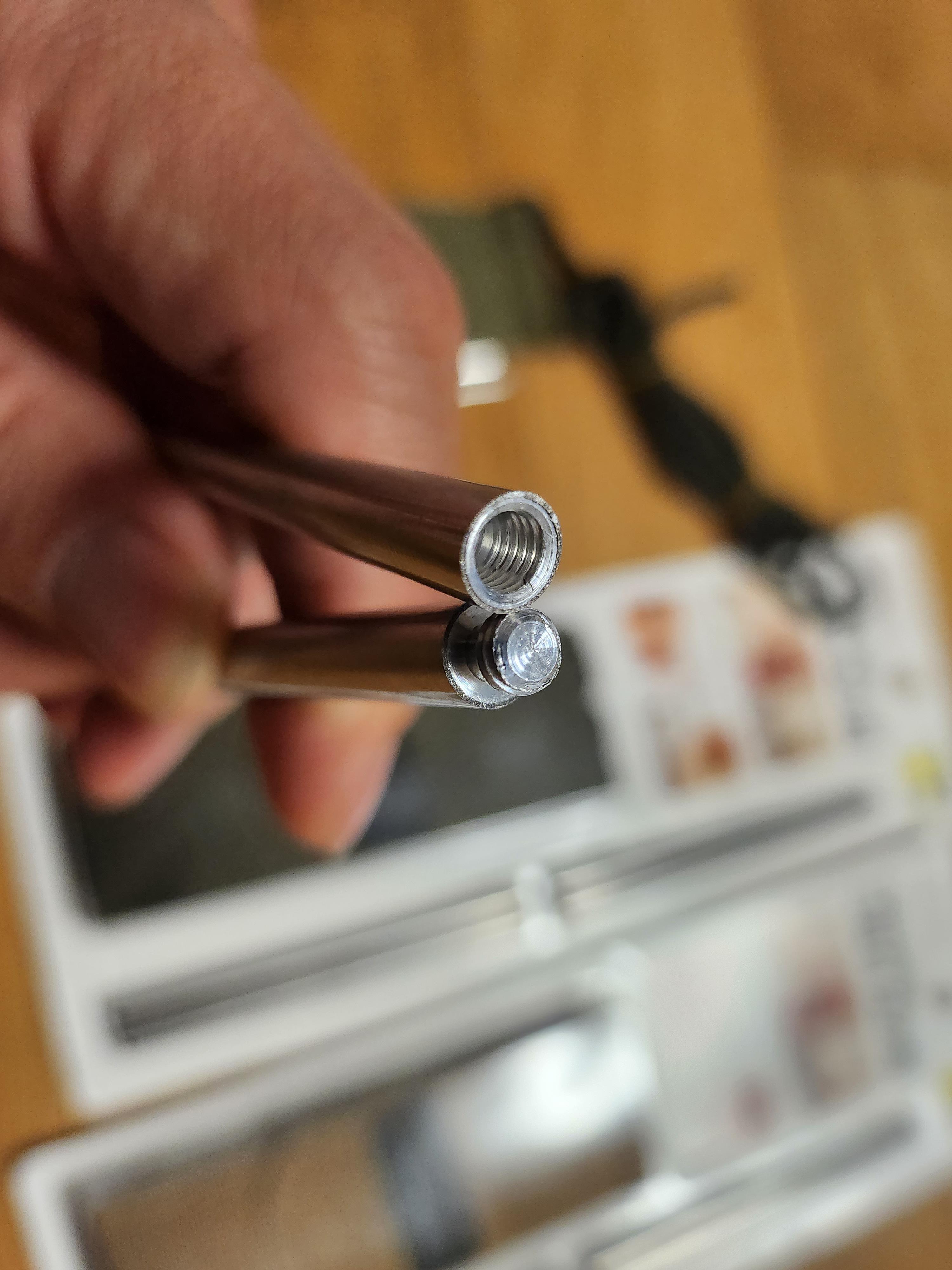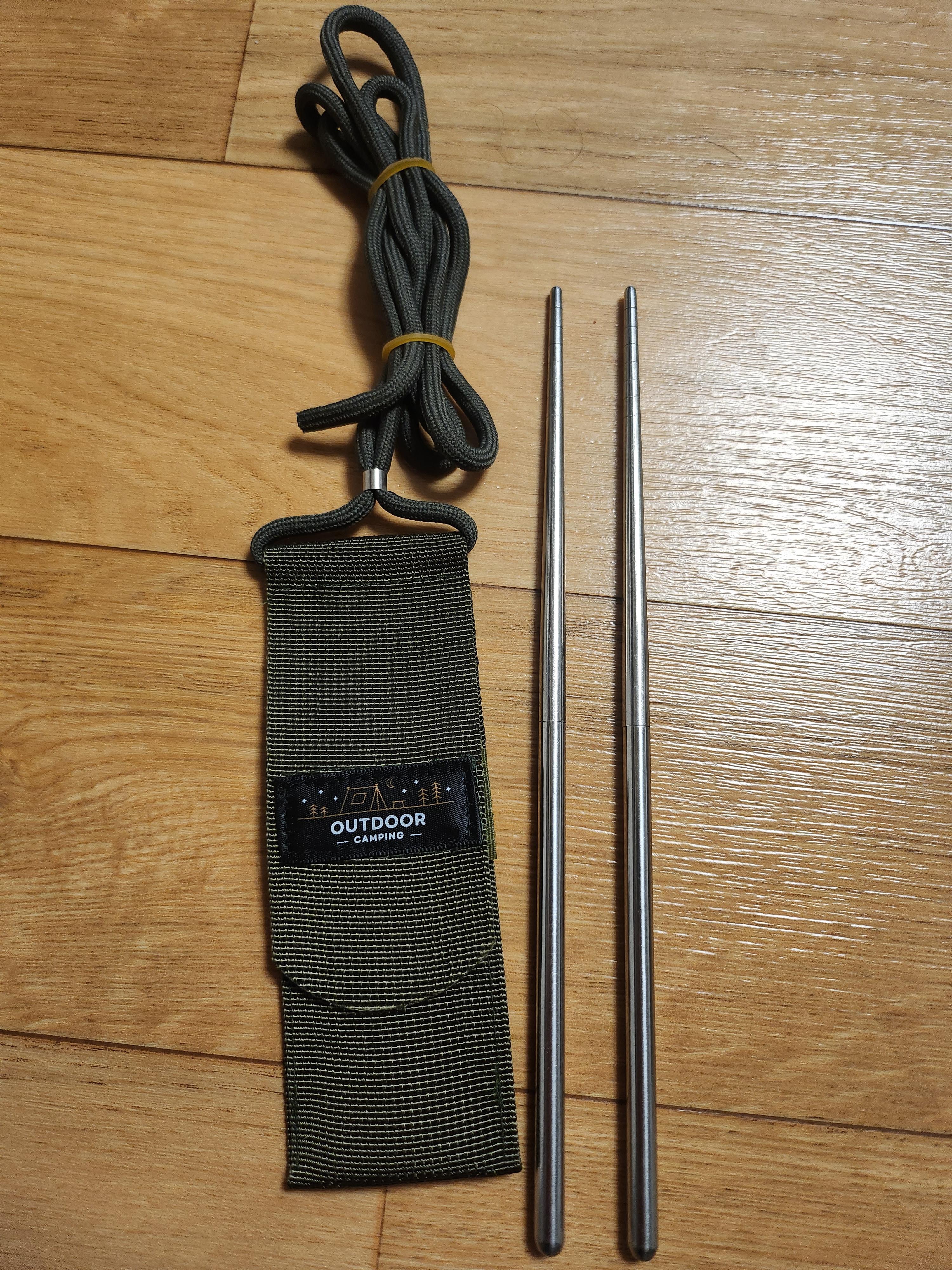 조립하면 22cm 정도 되는 길이입니다. 분리되어 있는 젓가락을 맞댄 후 몇 바퀴 돌리면 금방 조립이 끝납니다. 여기서 드는 한 가지 의문점은 굳이 젓가락 쓰는데 조립을 해야 하나? 또 파우치에 수납을 해야 하나? 파우치에 넣어 목걸이를 걸고 다녀야 하나? 이런저런 여러 가지 생각들이 스쳐 지나갑니다. 그렇지만 세상은 다양한 사고를 가진 사람들이 살아가는 세상이고 이 또한 필요한 분들이 계실 거라고 생각됩니다. 굳이 합리화를 시켜보자면 오토캠핑보다는 백패킹 하시는 분들에게 아주 유용할 수 있는 아이템일 것 같긴 합니다.