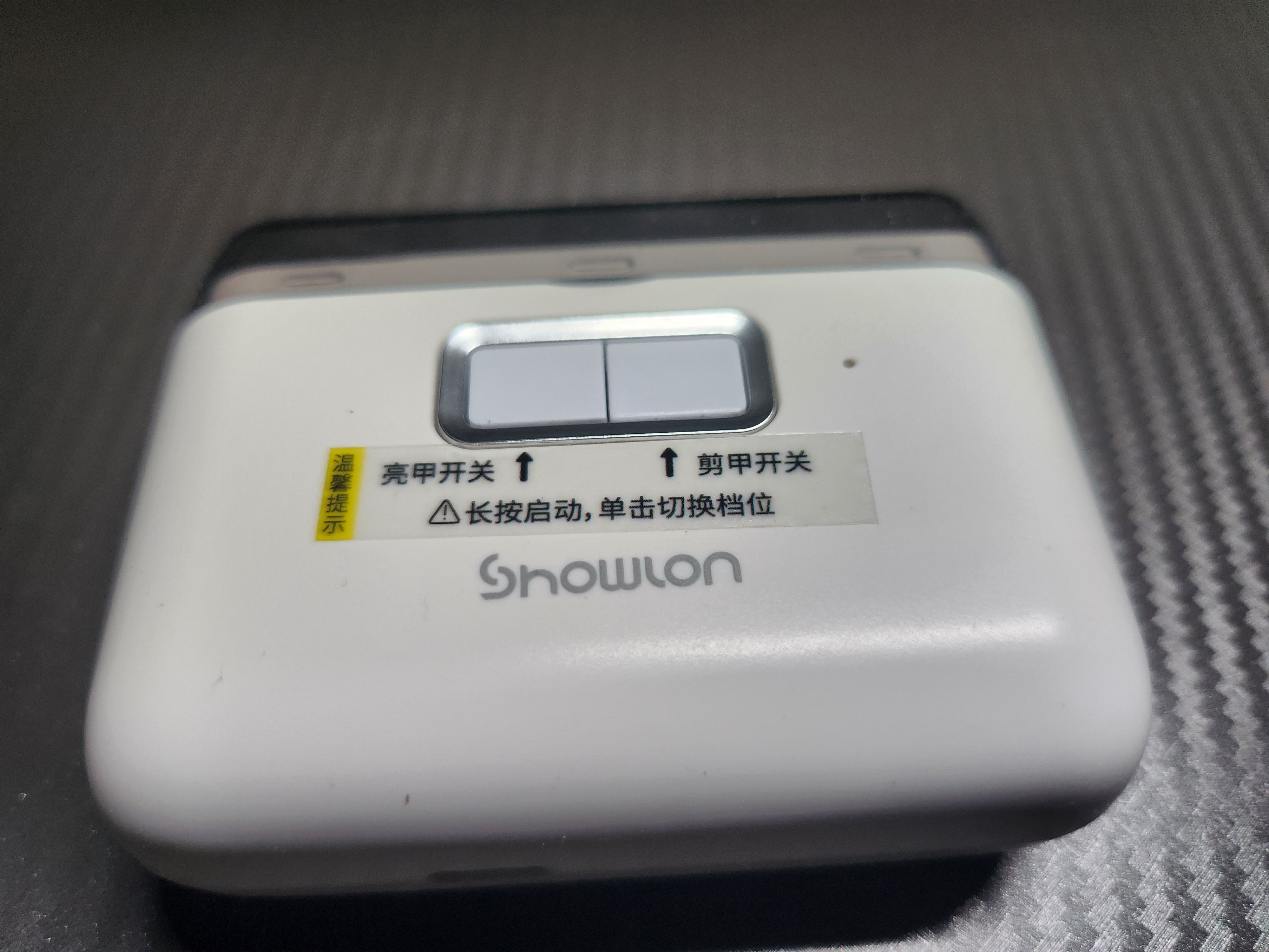 제품본체의 정면을 기준으로 왼쪽이 손톱광택 동작버튼 오른쪽이 손톱깎이 동작버튼입니다. 손톱광택과 손톱깎이 둘 다 동일하게 길게 누르면 동작되고 한 번 짧게 누르면 강하게 동작되고 한번 더 짧게 누르게 되면 정지됩니다.