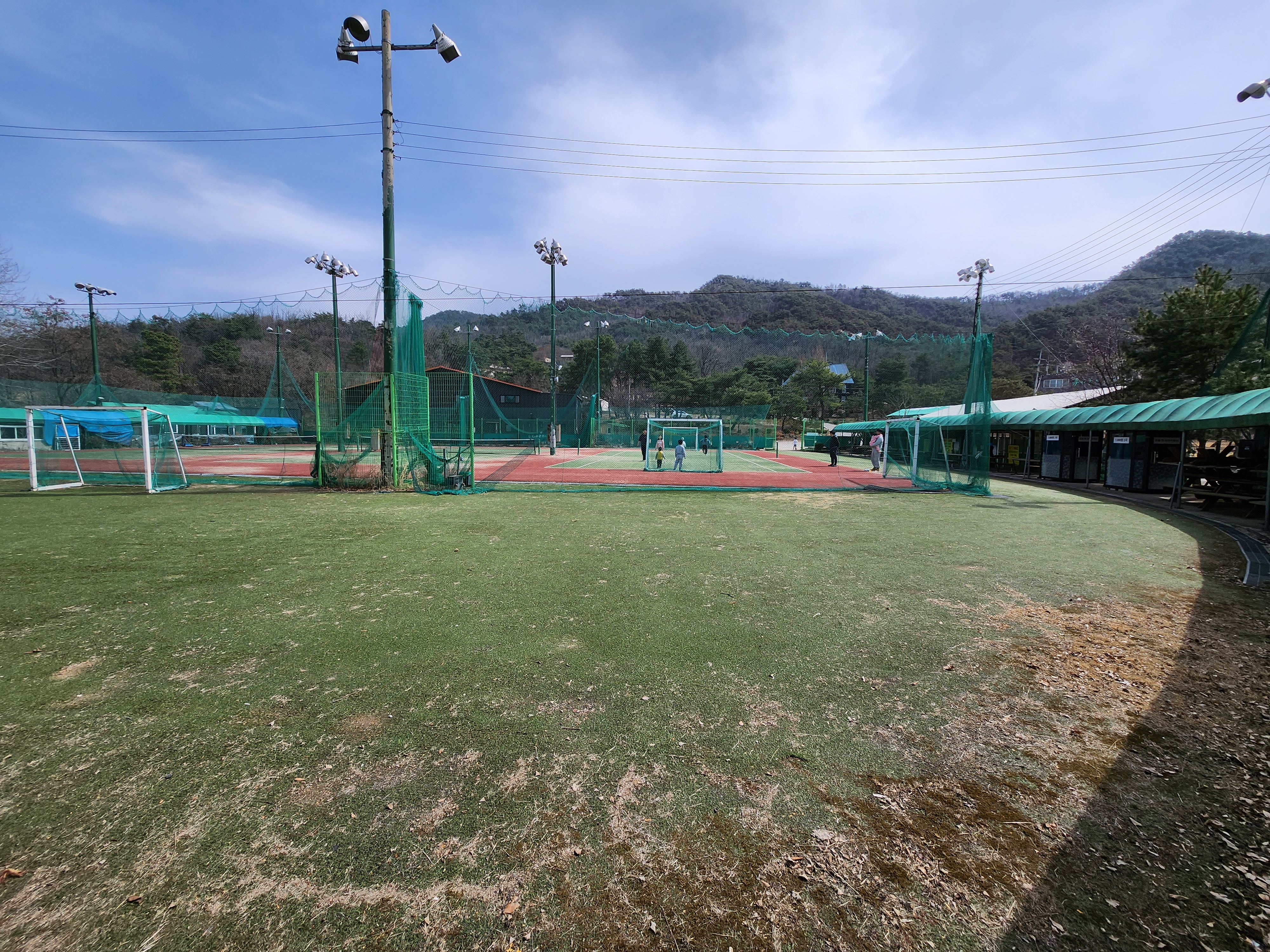 꽤나 큰 규모의 미니 축구장이 있으니 축구를 즐기실 수 있고 옆쪽으로는 테니장도 마련되어 있습니다. 미니 축구장 골대는 6 정도 준비되어 있으니 가볍게 운동할 수 있습니다.
