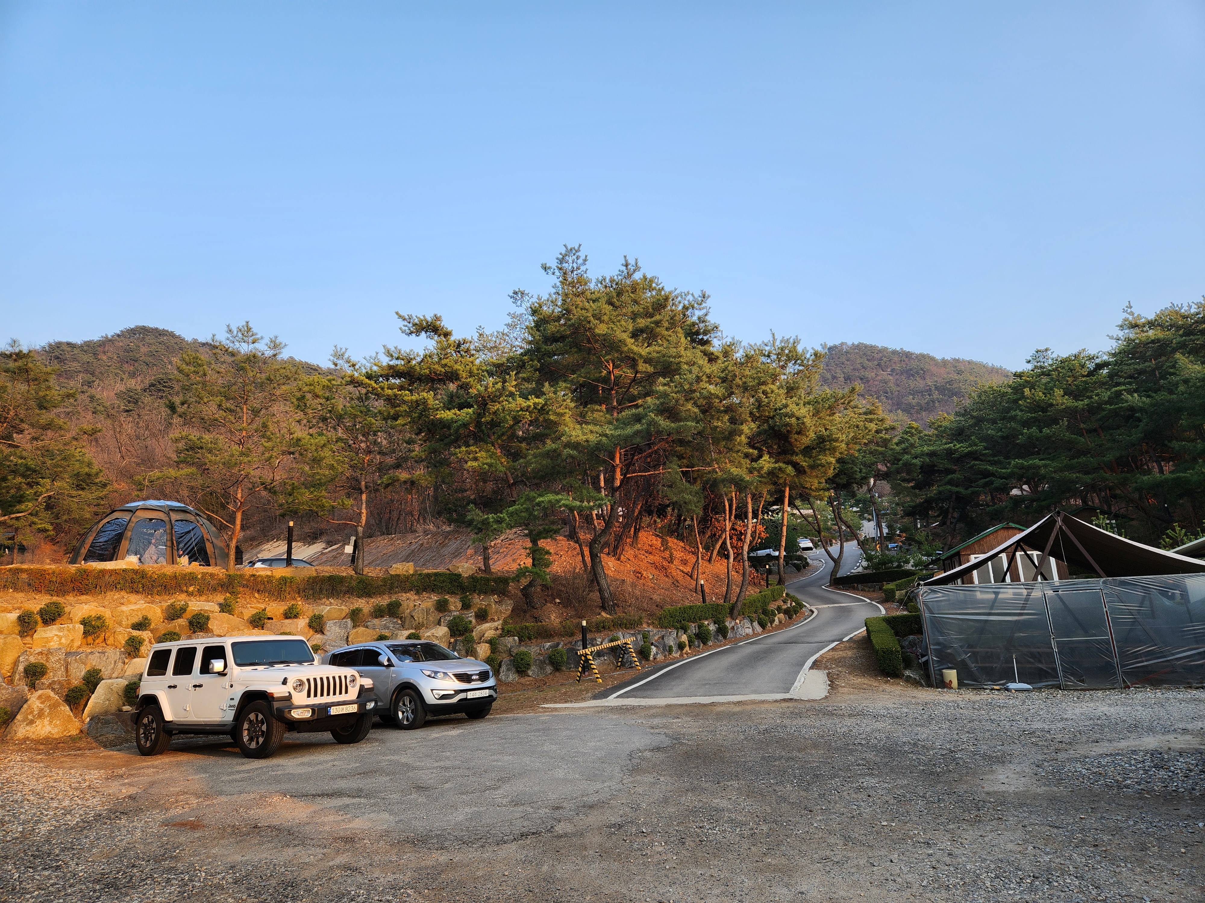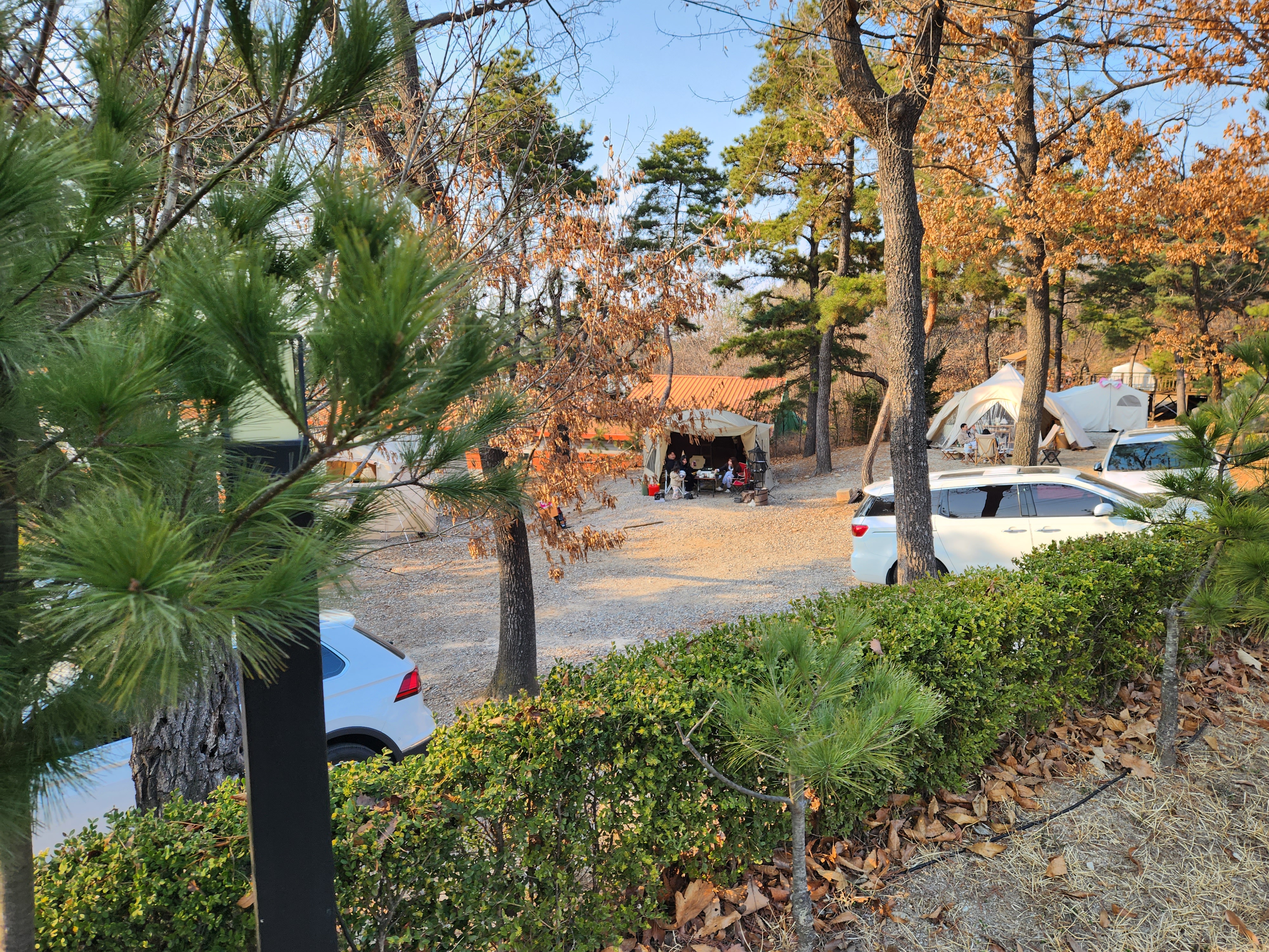 관리동에서 왼쪽 편으로 나오면 사진상에 왼쪽언덕 부분은 차박존 사이트이고 가운데 길을 따라 쭉 올라가면 파쇄석 C 사이트들이 1번 ~ 21번까지 계단식으로 배치되어 있습니다.