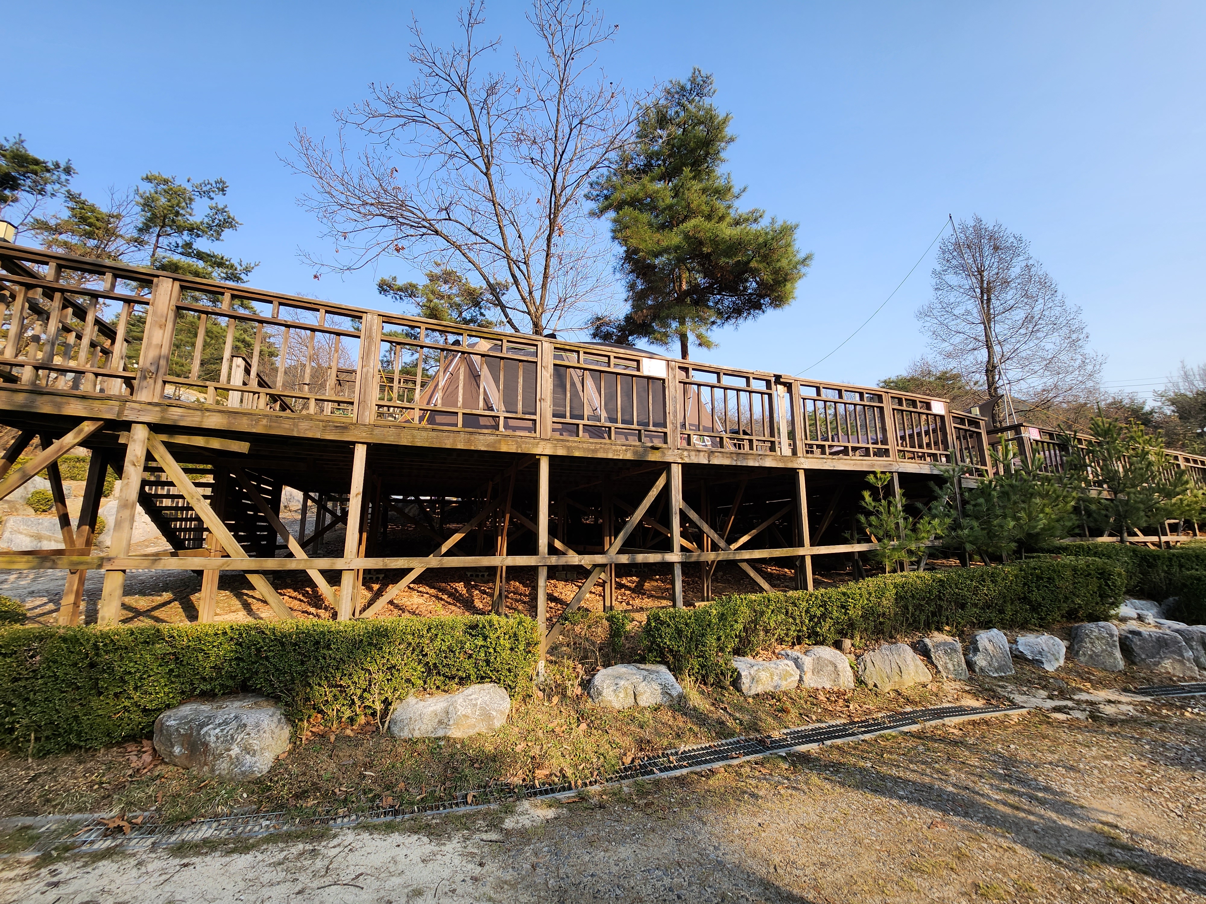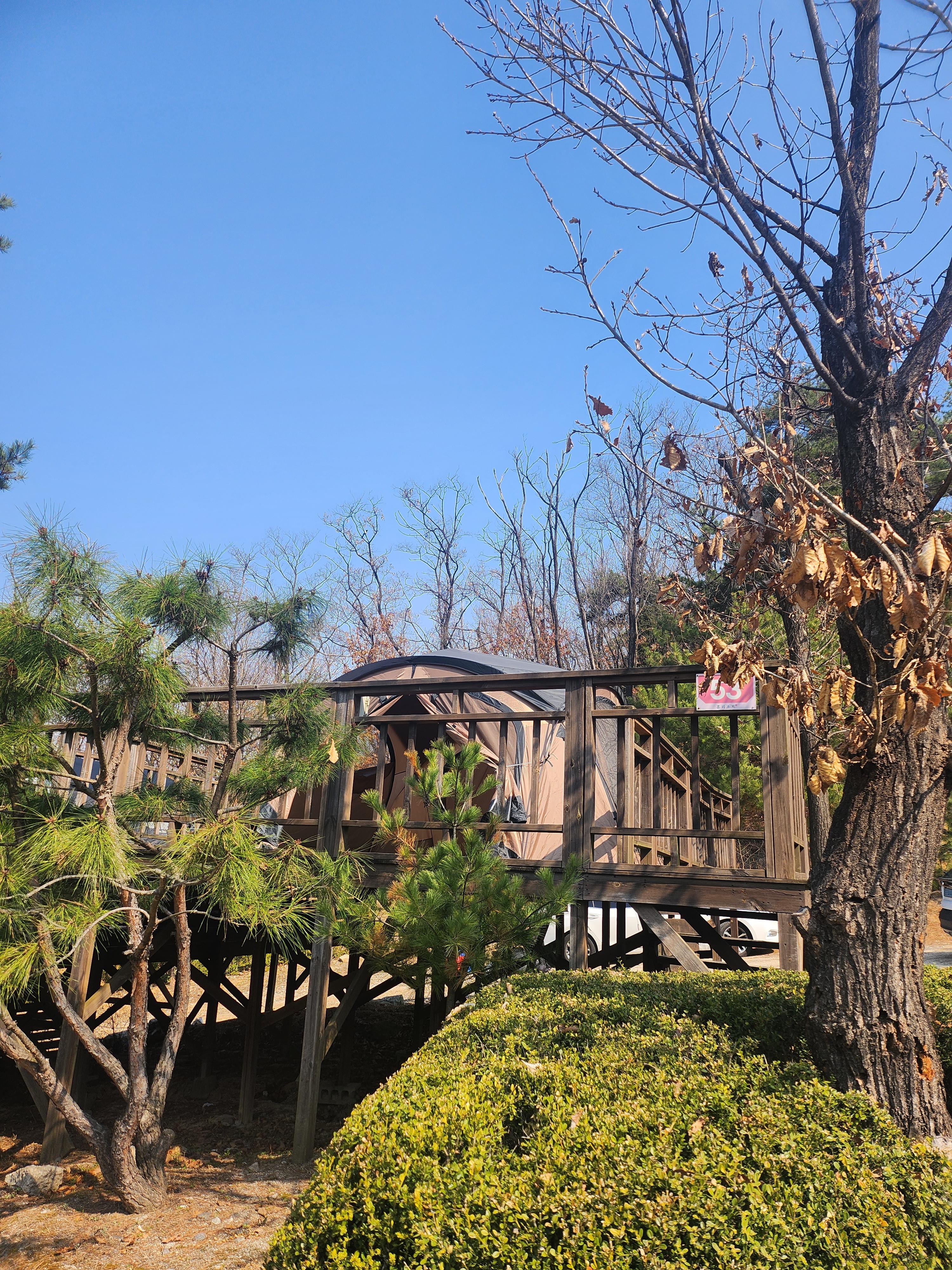 이곳은 왼쪽에 보이는 데크사이트 35번으로 시작하여 35번 사이트 언덕을 따라 뒤쪽으로 15번 ~ 35번까지 데크가 있습니다. 오른쪽에 나무에 가려져 있지만 길을 따라 안으로 들어가면 1번부터 14번까지 데크가 배치되어 있습니다.