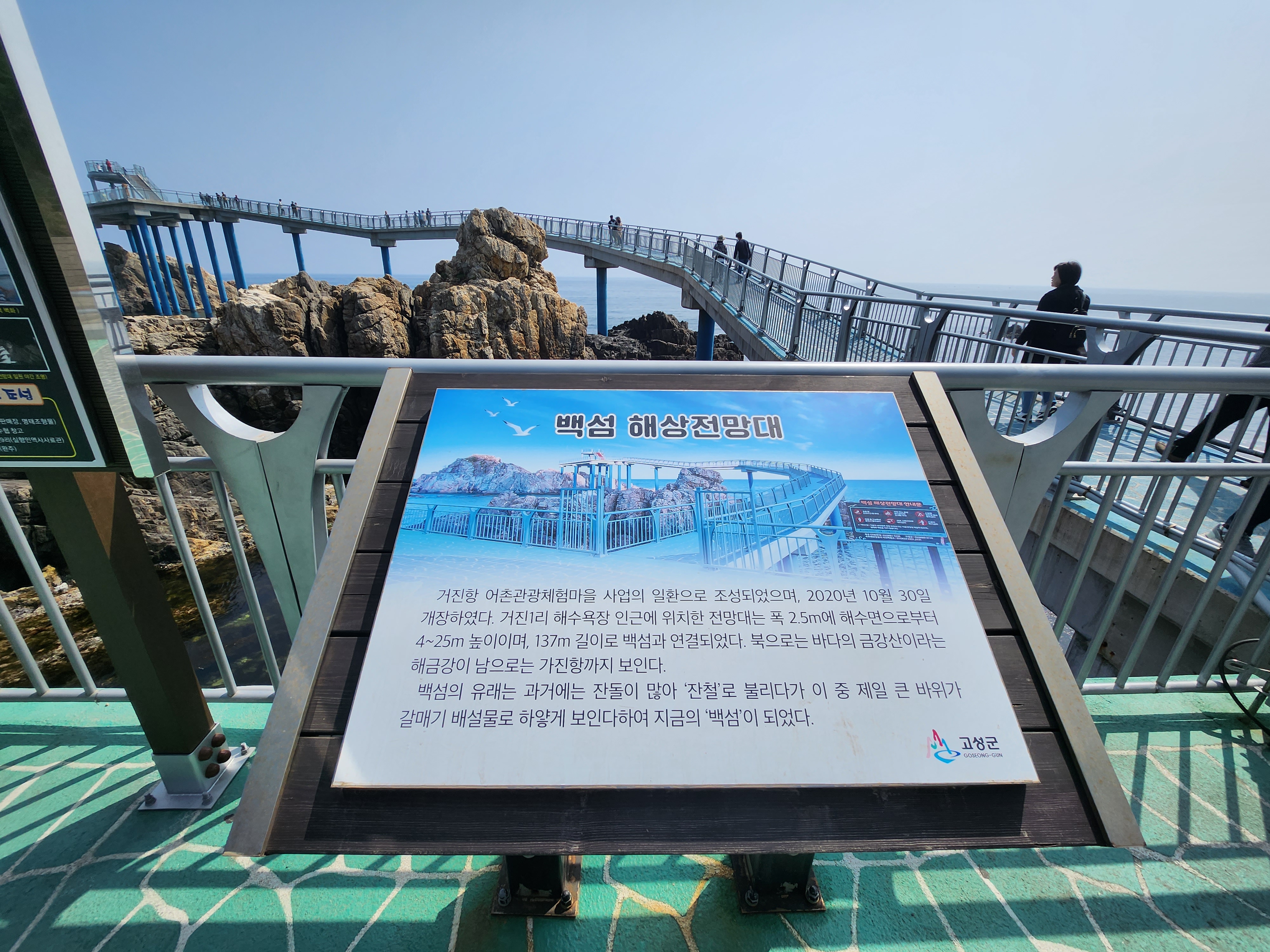 강원도 고성 백섬전망대는 거진항 어촌관광체험마을 조성사업의 일환으로 2019년 3월부터 2020년 10월에 걸쳐 조성되어 2020년 10월 30일부터 개방되어 운영되는 곳입니다. 전망대의 총길이는 137m, 높이는 4~25m 규모로 백섬(백암도)과 연결되었고 멋진 동해바다 위를 걸으며 북으로는 해금강 남쪽으로는 거진항구와 해변이 펼쳐져 자연경관이 장관을 이루는 곳입니다. 백섬의 유래는 과거를 살펴보면 잔돌이 많아 잔철로 불리다가 이 중 제일 큰 바위가 갈매기 배설물로 하얗게 보인다 하여 지금의 백섬이 되었다고 합니다. 백섬전망대는 관람요금과 주차장이 무료로 운영되고 있으며, 주차장이 잘 마련되어 있고 개수가 많지는 않지만 관람시간이 길지 않아 크게 붐비지는 않습니다. 고성에 가신다면 한 번 방문해 보시면 좋겠습니다.